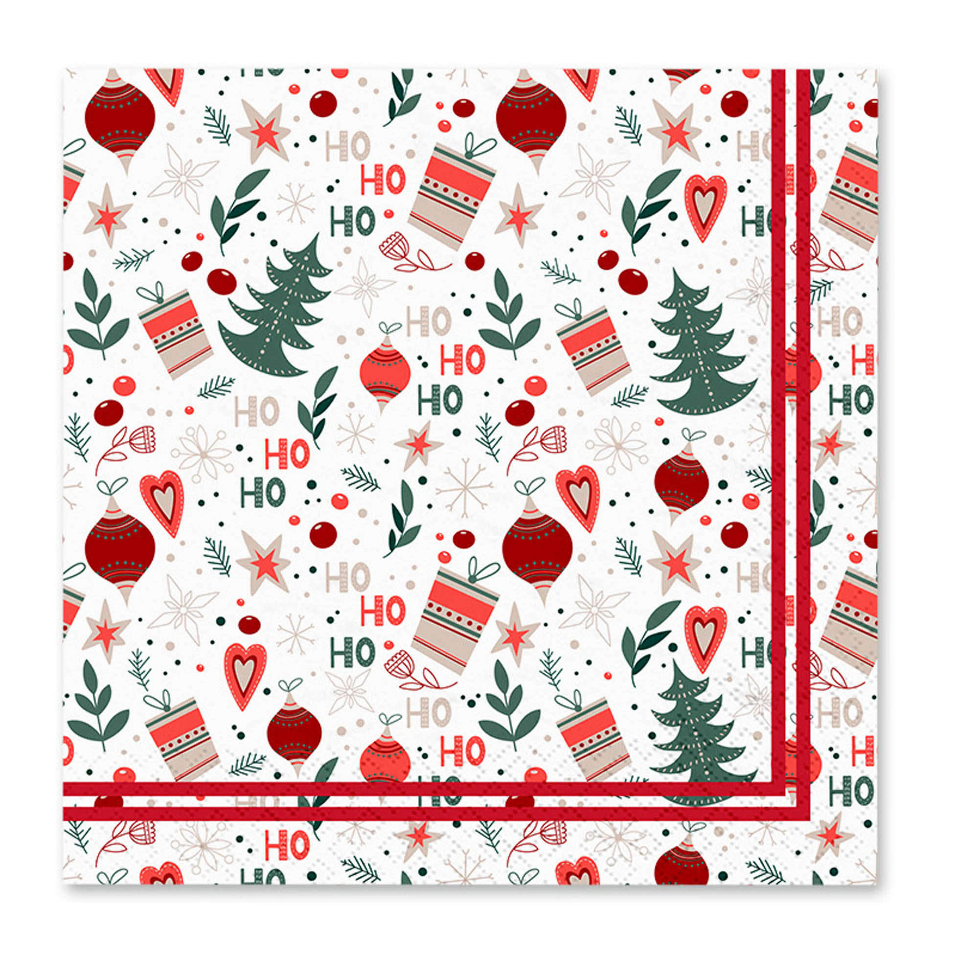 Apportez une ambiance festive et chaleureuse à votre table avec ce lot de 20 serviettes en papier décorées de motifs traditionnels de Noël : sapins, cadeaux, boules rouges, étoiles, cœurs et l’inscription “HO HO HO”. Une décoration joyeuse et colorée, parfaite pour les repas de fin d’année.