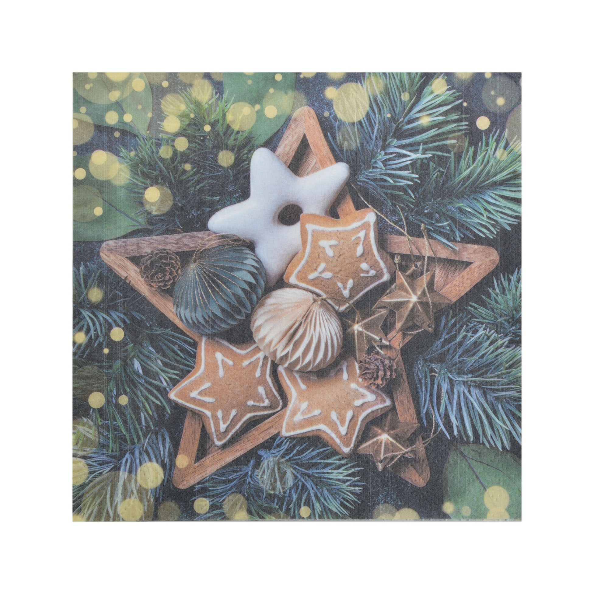 Apportez une ambiance gourmande et festive à votre table avec ce lot de 20 serviettes en papier décorées d’une étoile en bois remplie de biscuits de Noël, entourée de branches de sapin et de lumières dorées. Un design chaleureux, idéal pour les repas de fin d’année.
