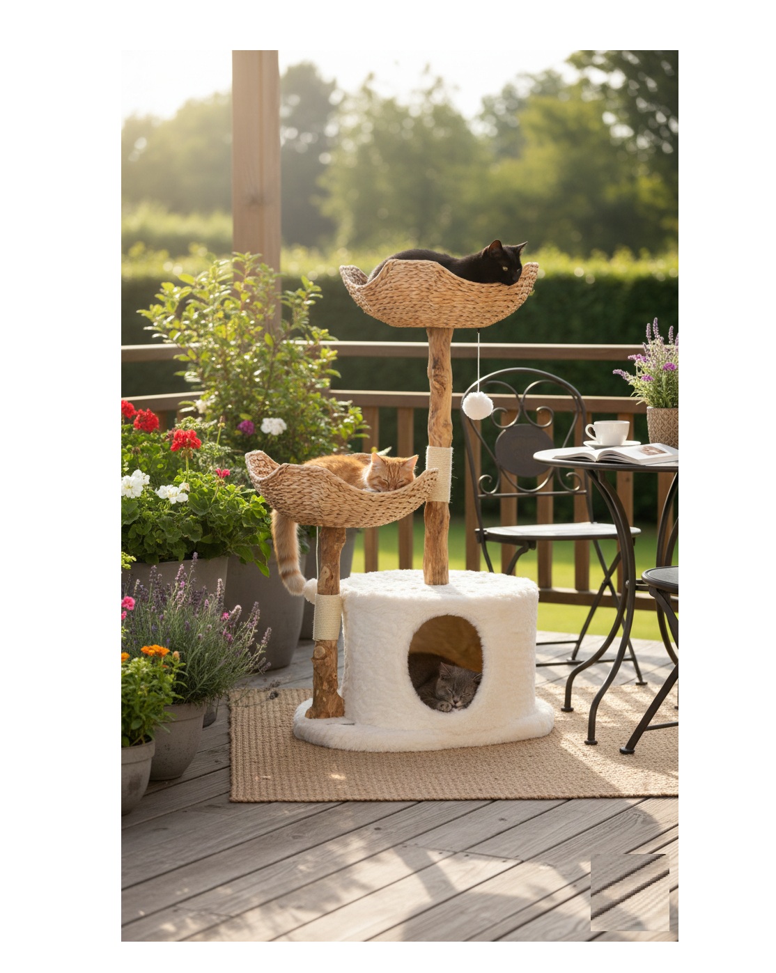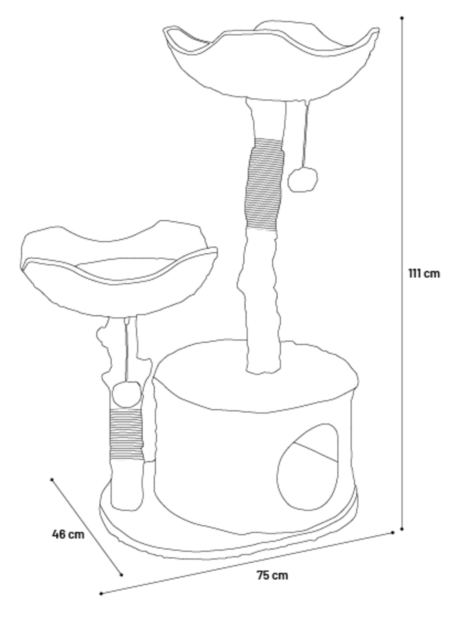 L’arbre à chat Hector dispose de plusieurs plateformes équipées de coussins rembourrés amovibles, parfaits pour se détendre ou observer l’environnement en hauteur. Une cachette intérieure douce et confortable permet à votre chat de se réfugier en toute tranquillité pour dormir ou se reposer à l’abri des regards.