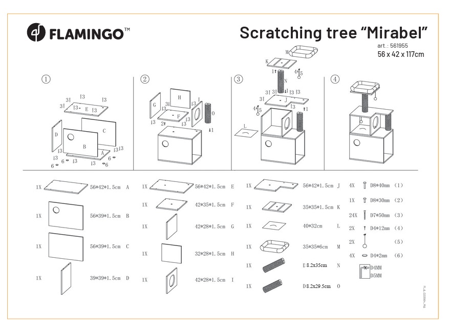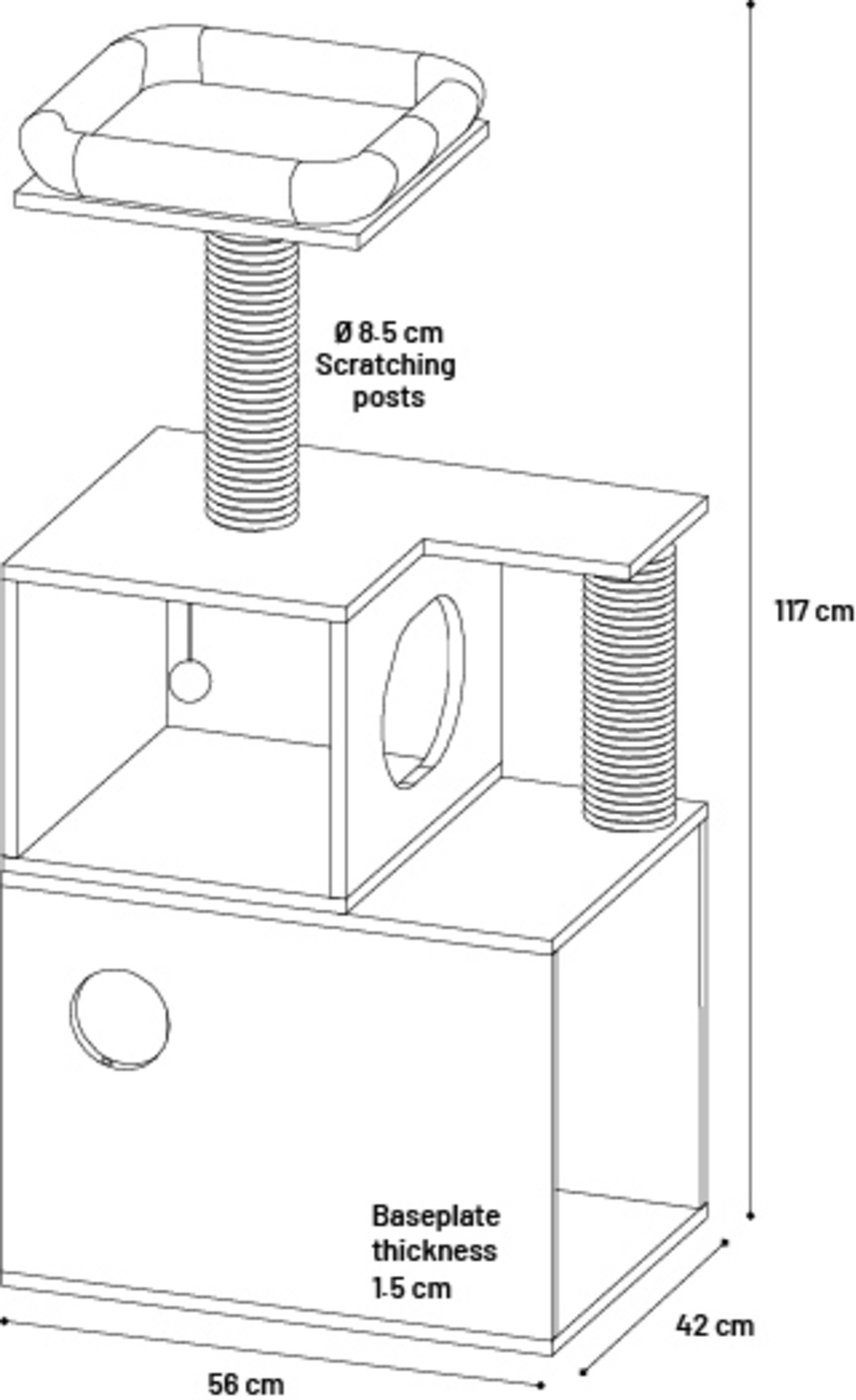 Pensé comme un meuble malin, Mirabel dispose d’une plateforme supérieure avec panier matelassé amovible, idéale pour les siestes en hauteur, ainsi que d’une cachette confortable avec coussin pour les moments de calme. Un espace séparé permet d’accueillir un bac à litière, pour un intérieur plus discret et organisé. Les poteaux à griffer en corde papier favorisent l’entretien des griffes, tandis qu’un jouet suspendu stimule l’instinct joueur.