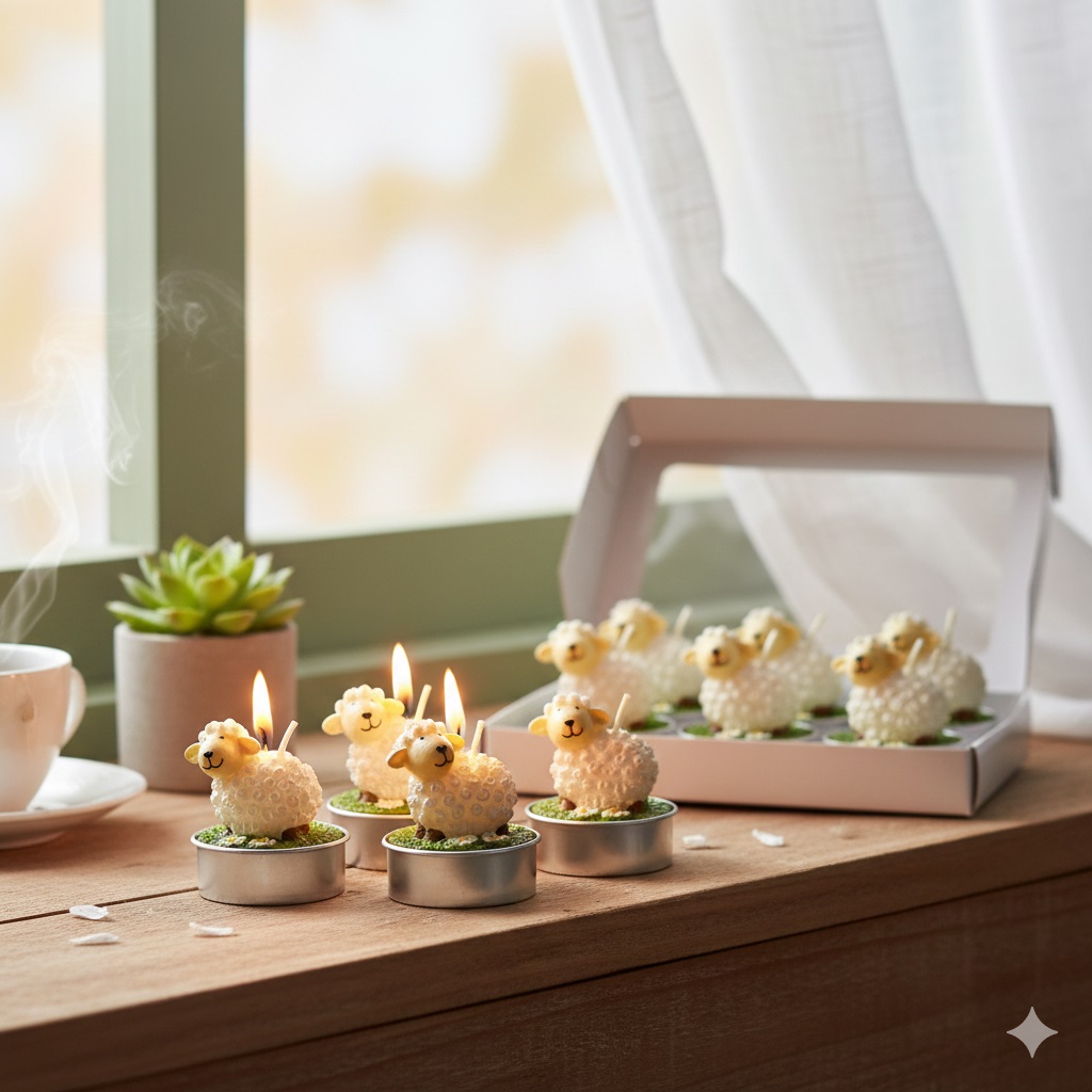 Craquez pour ce lot de 6 bougies chauffe-plat en forme de petits moutons, parfait pour apporter une touche bucolique et joyeuse à votre décoration de table. Chaque bougie est moulée en cire blanche avec des détails soignés : laine bouclée, visage souriant, socle vert fleuri.