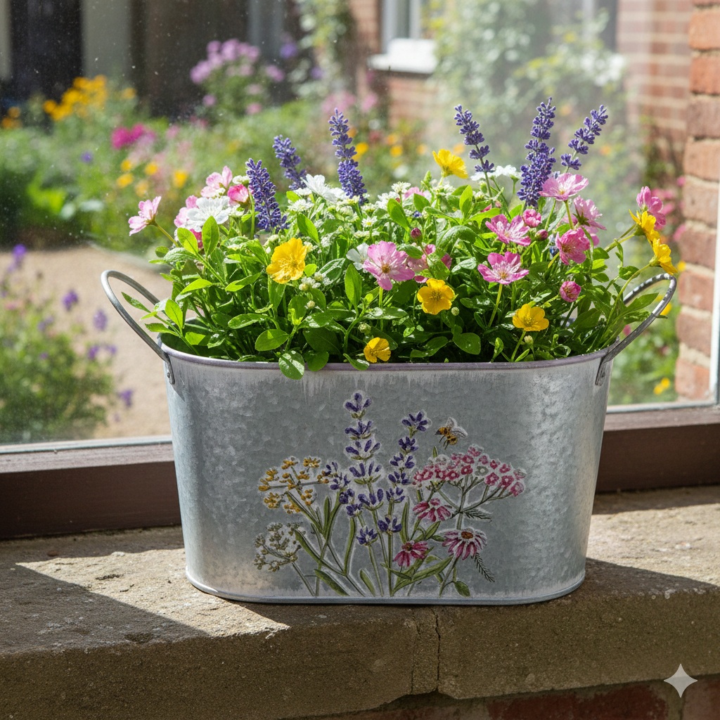 Apportez une touche authentique et champêtre à votre décoration avec ce bac à fleurs en zinc au décor floral délicatement imprimé. Son aspect légèrement vieilli, associé à des motifs de fleurs sauvages aux tons doux, évoque l’élégance des jardins de campagne et des maisons de charme.
