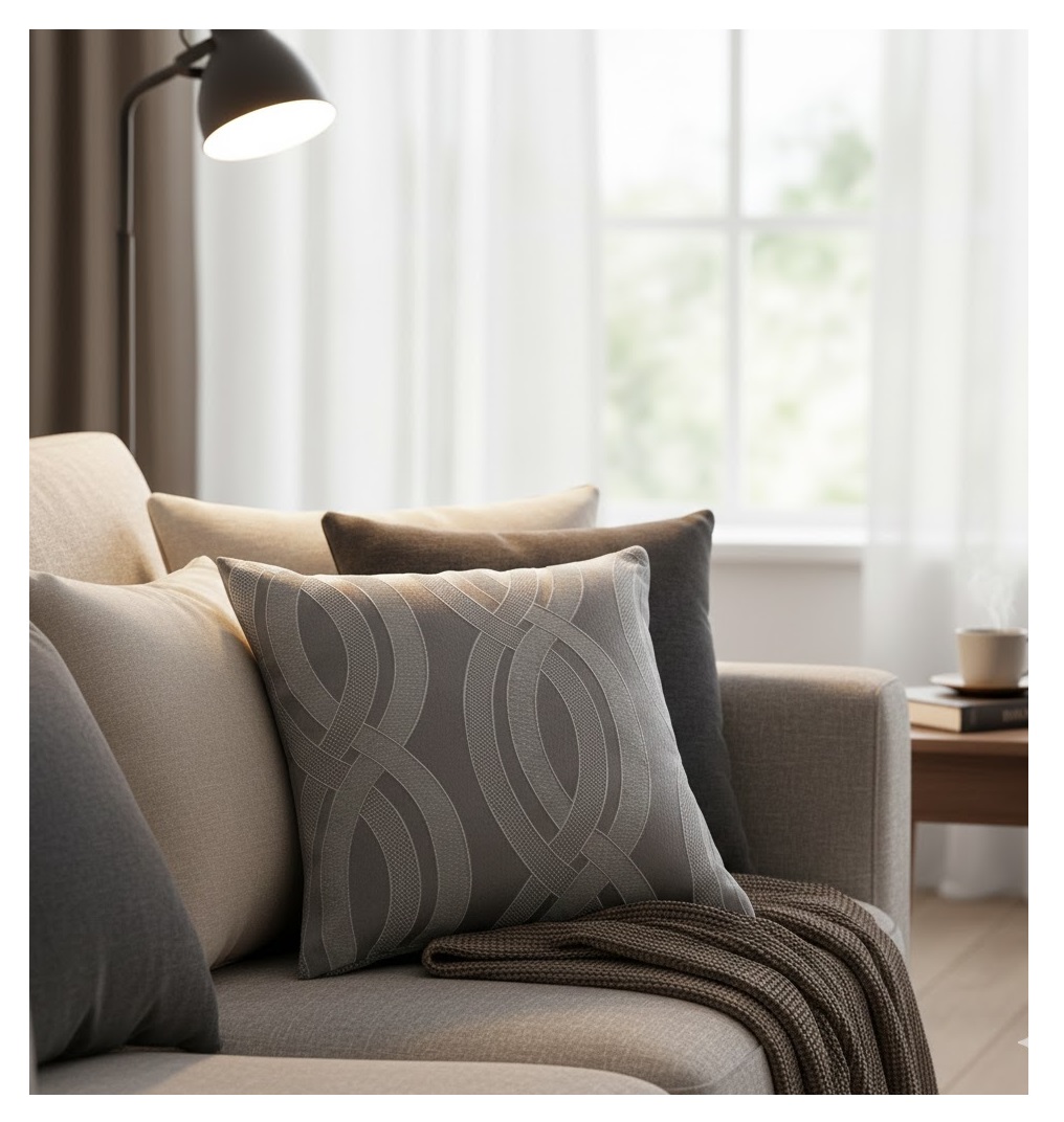 Apportez une touche moderne et graphique à votre décoration avec le coussin Jacquard Miriade. Son motif de rubans ondulés en jacquard sur fond uni crée un effet élégant et contemporain, idéal pour sublimer un canapé, un fauteuil ou un lit.