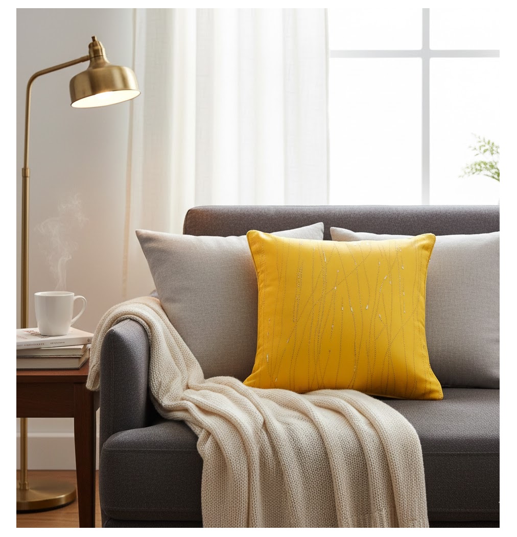 Produit : coussin décoratif Collection : Filliane Dimensions : 60 x 60 cm Enveloppe : 100 % polyester Motif : filaments verticaux argentés sur fond uni Finition : passepoil Non déhoussable