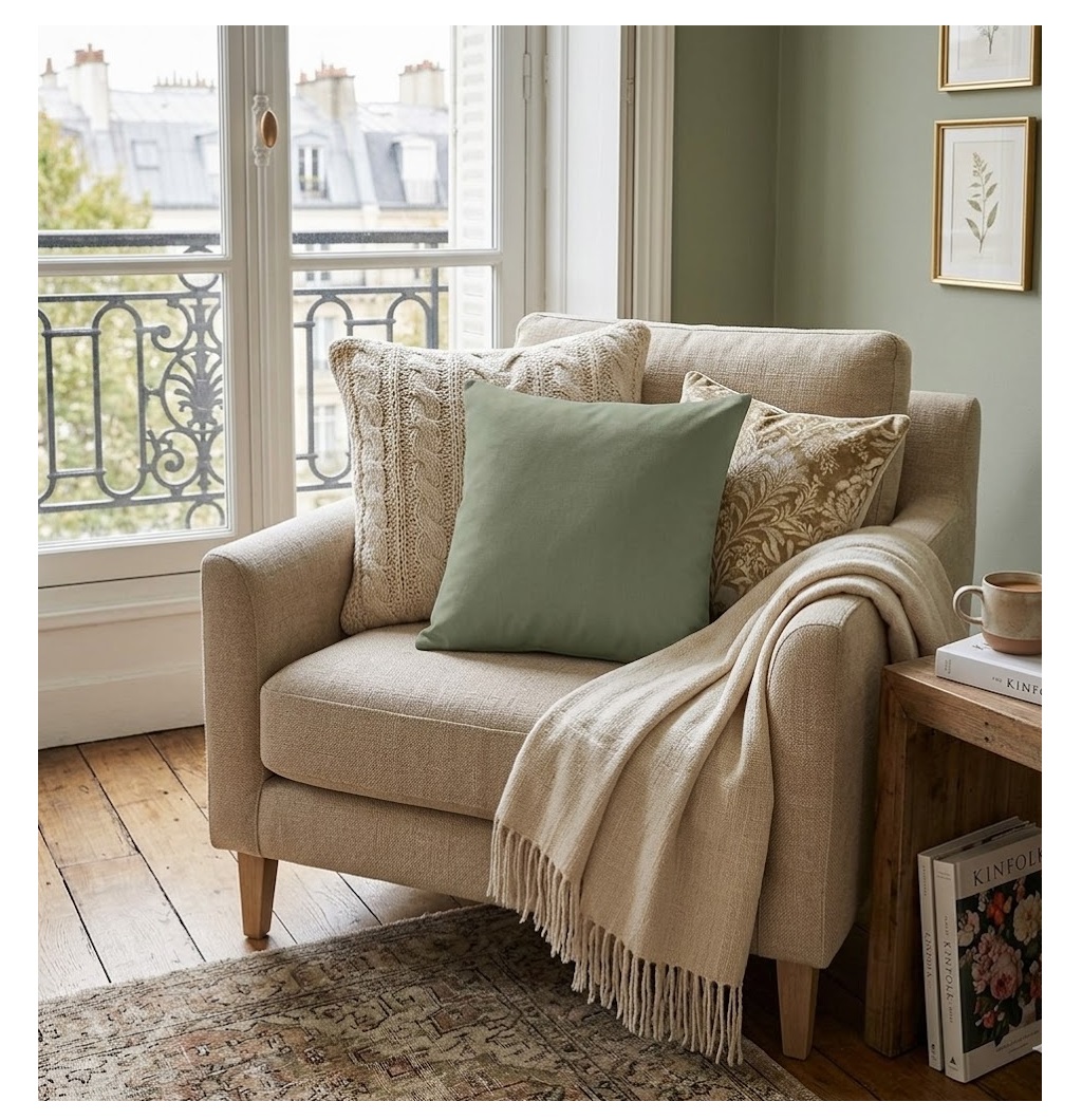 • Dimension : 40 x 40 cm • Couleur : sauge élégant • Enveloppe : 100% polyester • Intérieur : fibres 100% polyester • Design uni moderne et polyvalent • Certification Oeko-Tex® • Confort moelleux au quotidien