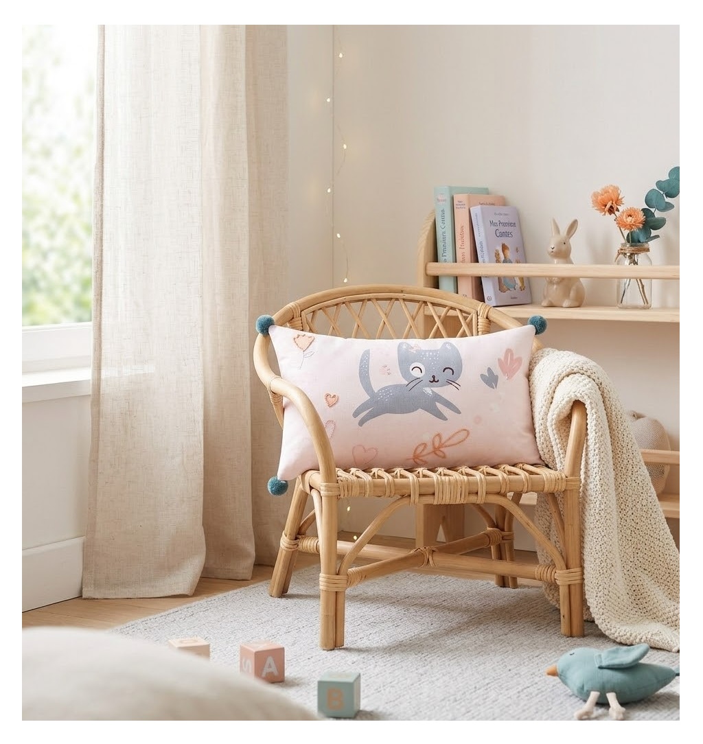 Apportez douceur et charme à la chambre des petites princesses avec le coussin Zoeline le Chat.