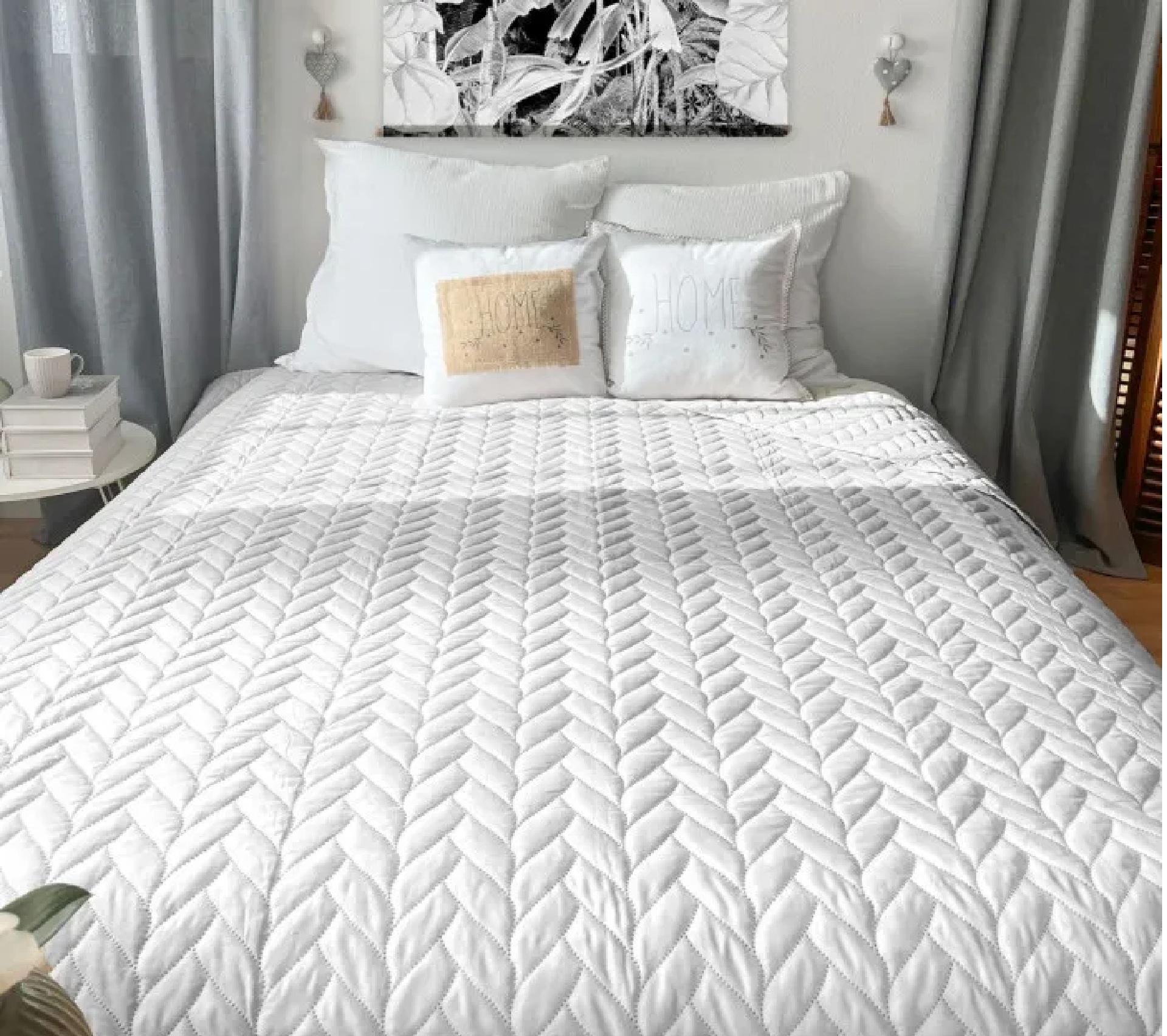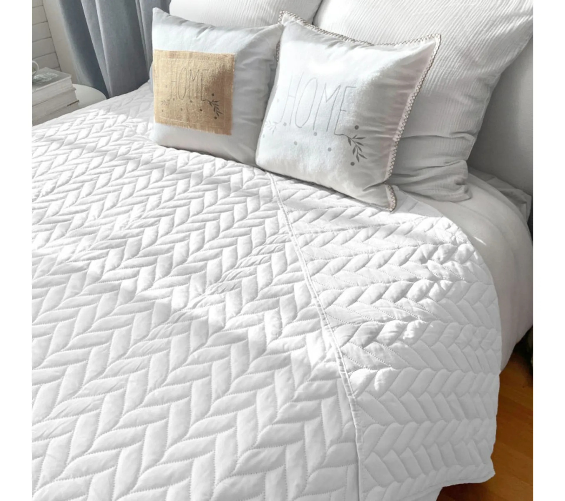 Son motif matelassé par ultrason, réalisé sans couture, crée un relief délicat et homogène qui habille instantanément le lit.