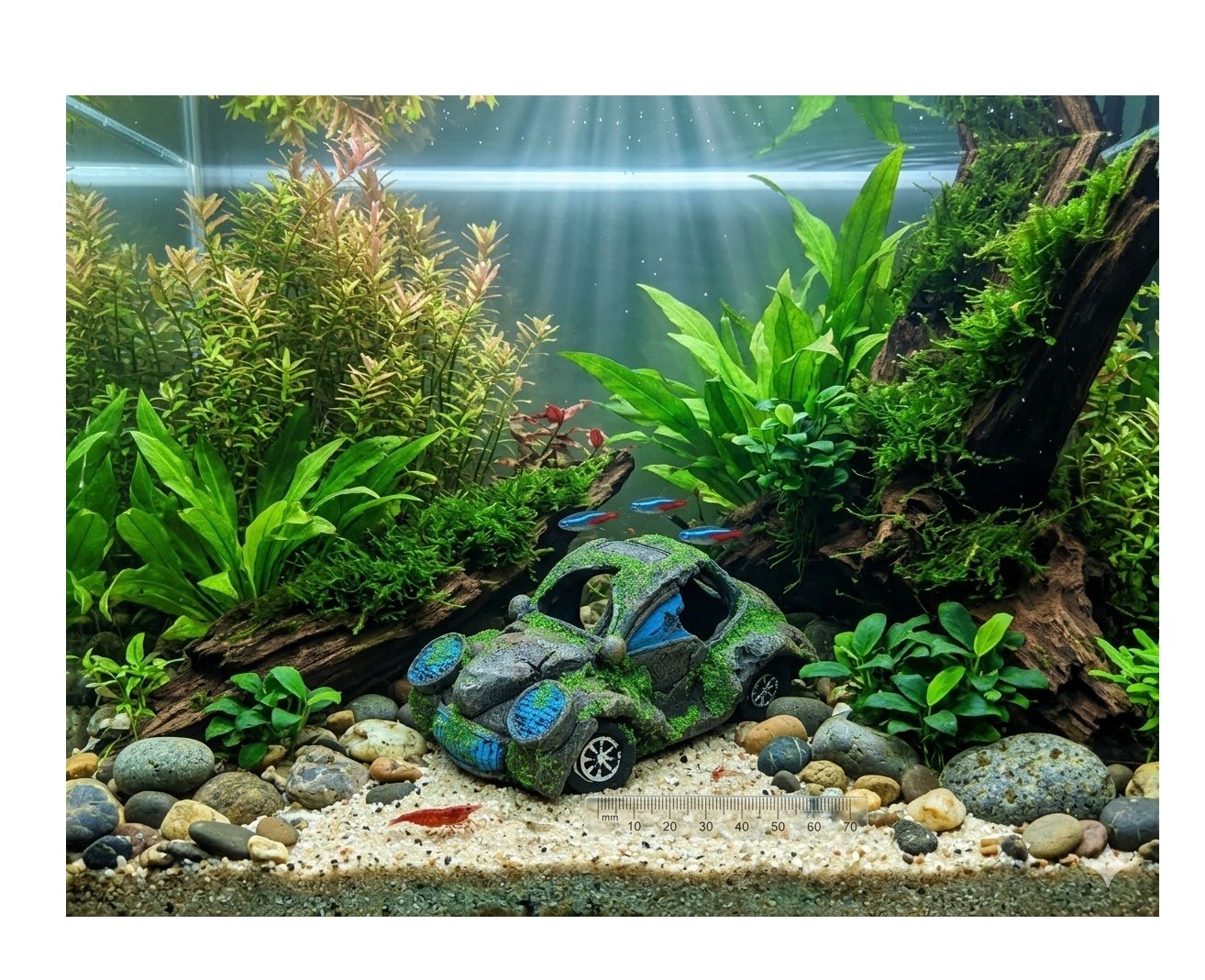 Apportez une ambiance originale et pleine de caractère à votre aquarium avec cette décoration en forme de voiture scarabée végétalisée. Son effet mousse réaliste crée un décor naturel et insolite qui attire immédiatement le regard.