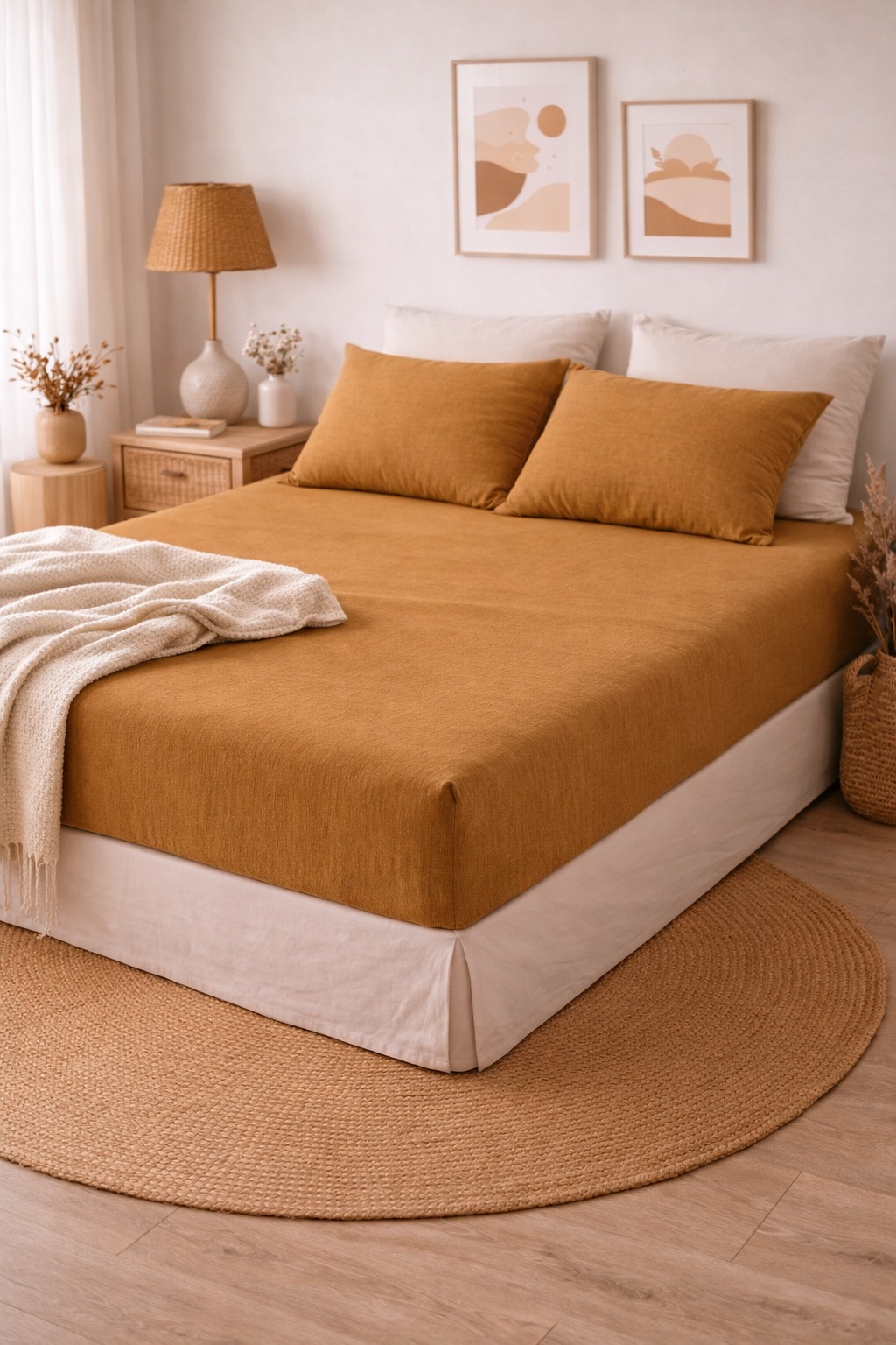 • Dimensions : 180x200 cm • Matière : 100% coton – double gaze (125 g/m²) • Bonnet extensible : jusqu’à 30 cm • Confort : matière respirante, souple et naturellement froissée • Entretien facile : lavable à 40°C (60°C pour le blanc) • Repassage inutile grâce à l’aspect gaufré naturel • Style : bohème, authentique et intemporel • Coloris : camel