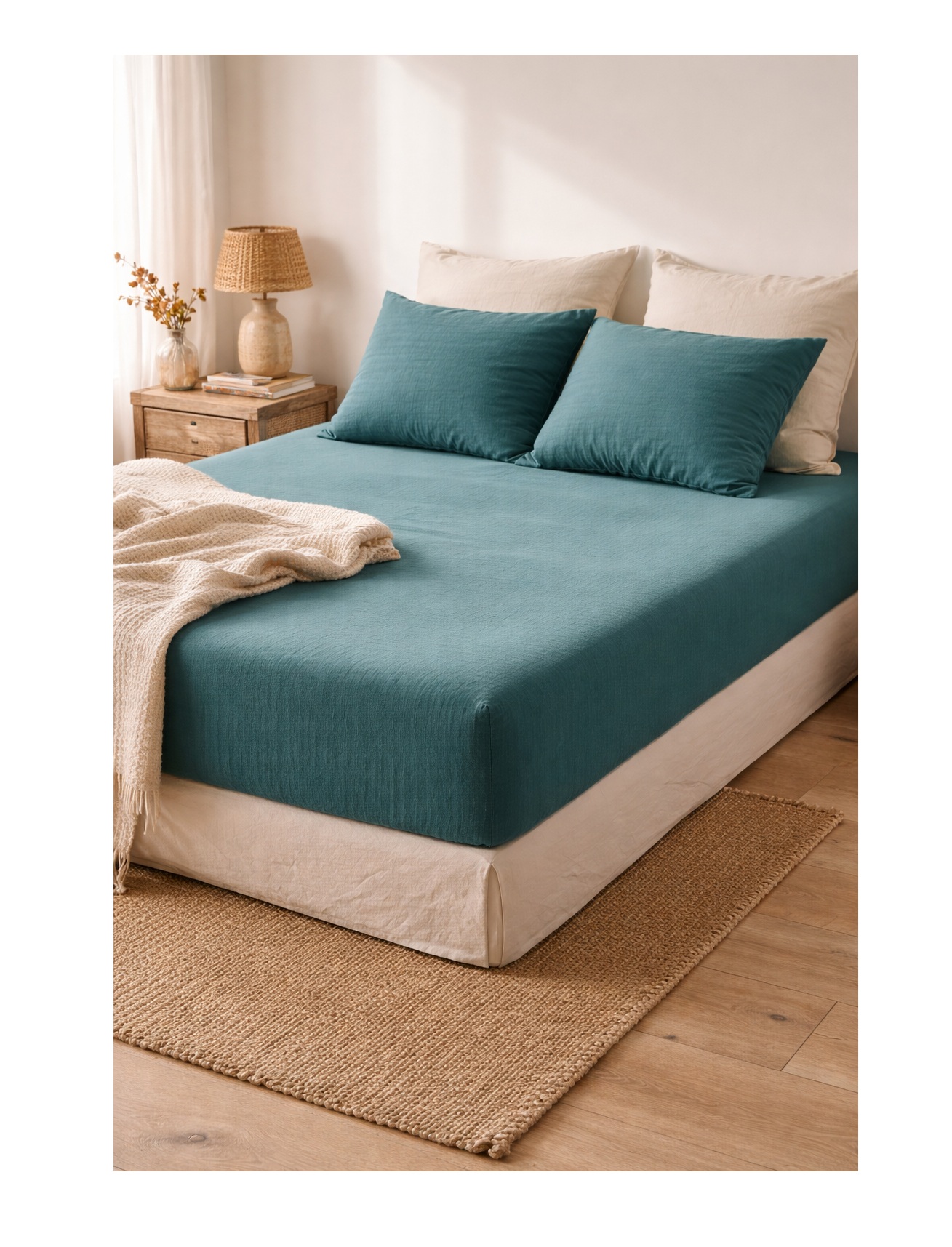 • Dimensions : 90x190cm • Matière : 100% coton – double gaze (125 g/m²) • Bonnet extensible : jusqu’à 30 cm • Confort : matière respirante, souple et naturellement froissée • Entretien facile : lavable à 40°C (60°C pour le blanc) • Repassage inutile grâce à l’aspect gaufré naturel • Style : bohème, authentique et intemporel • Coloris : canard