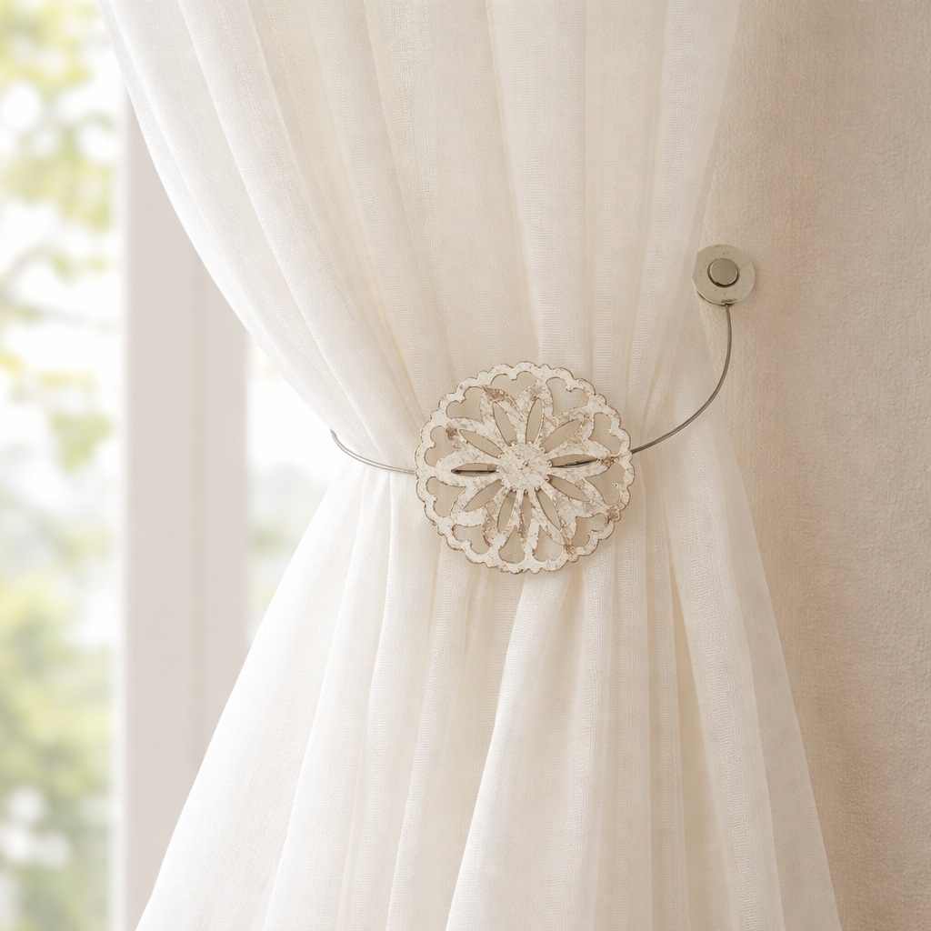 Apportez une touche d’élégance et de raffinement à votre décoration avec cette embrasse aimantée en métal patiné. Idéale pour maintenir vos voilages ou rideaux ouverts, elle s’installe facilement sans perçage grâce à son système magnétique pratique et discret. Son design travaillé et sa finition patinée apportent du charme et du caractère à votre intérieur, tout en laissant entrer la lumière naturellement.