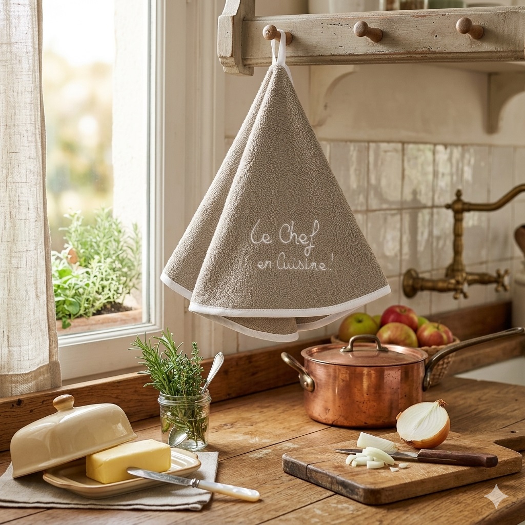 Apportez une touche d’originalité à votre cuisine avec l’essuie-main rond « Le chef en cuisine ».