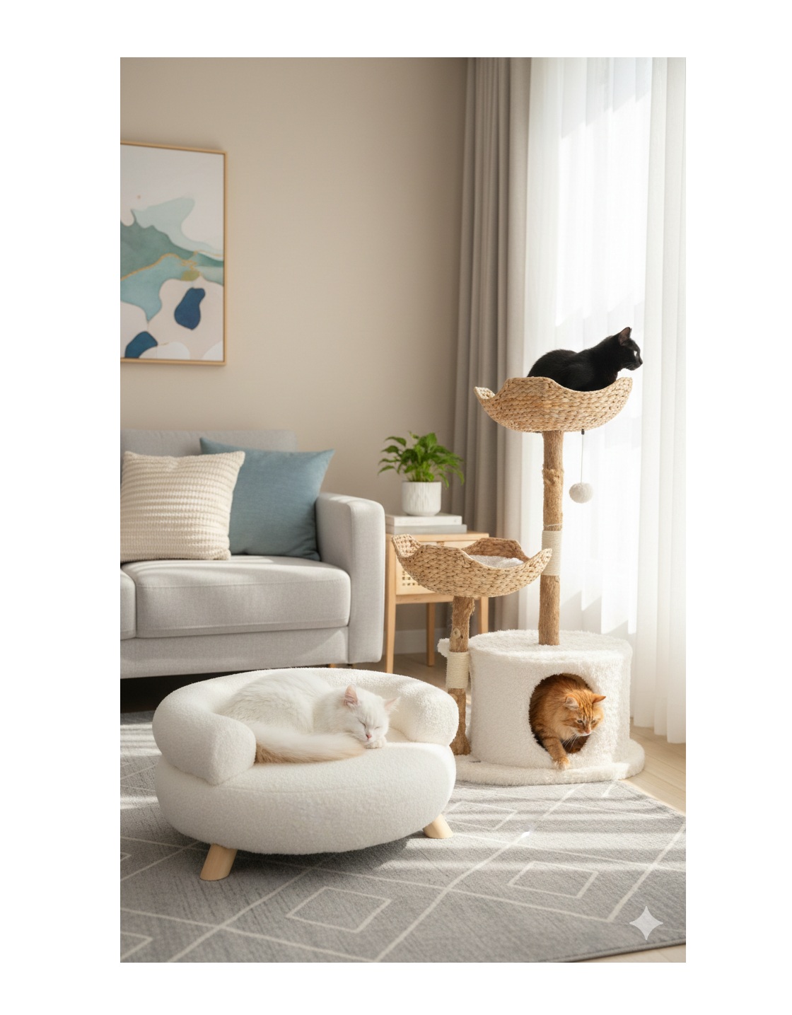 Ce sofa est conçu avec une structure solide en bois et un revêtement en textile doux (240 g/m²) agréable au toucher. Son assise moelleuse, garnie de mousse PU (polyuréthane), assure un excellent confort pour les siestes et les moments de repos. Grâce à sa forme ronde enveloppante et ses accoudoirs, votre chat ou petit chien pourra s’y installer confortablement, se blottir et profiter d’un maintien agréable.
