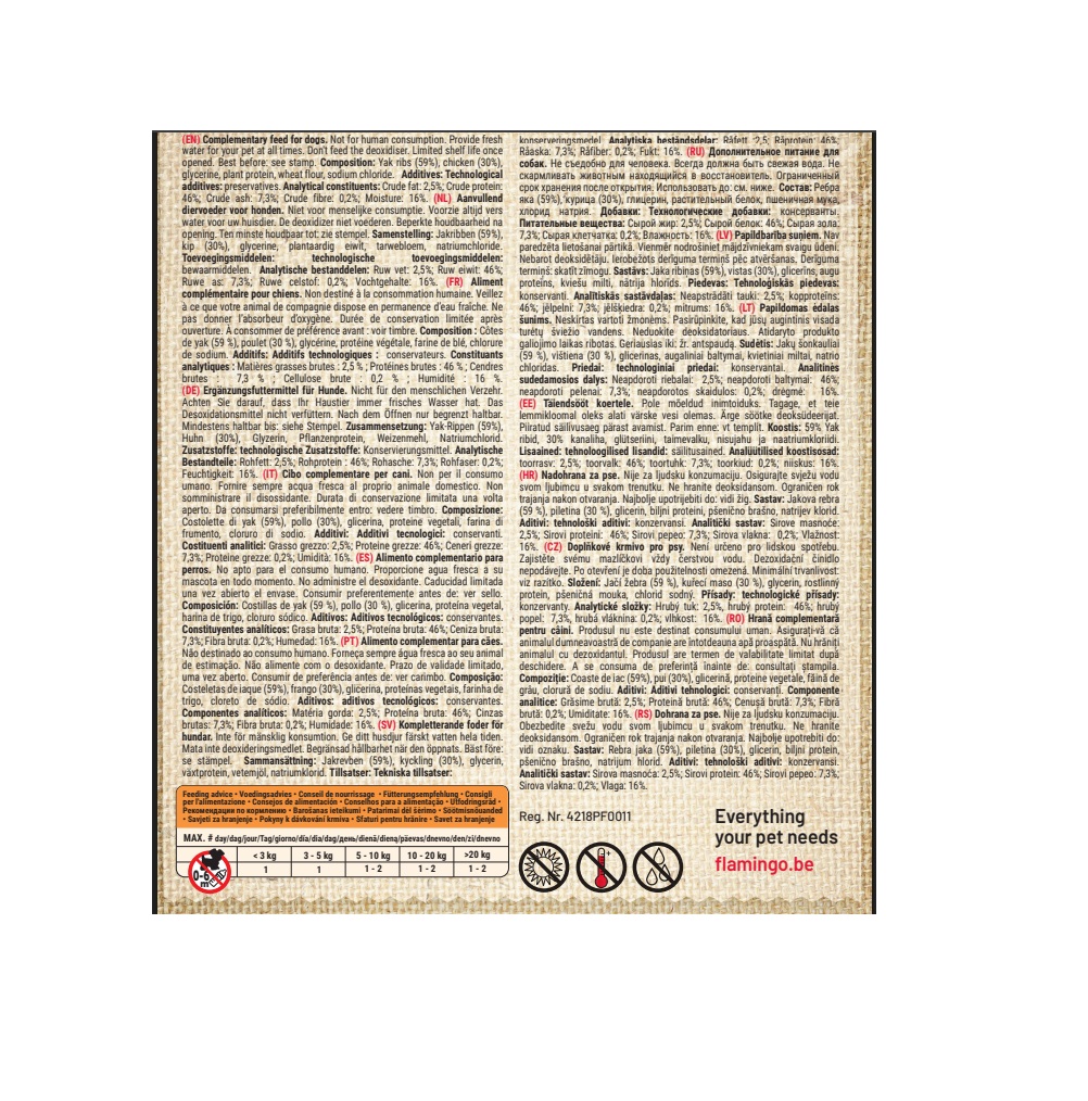 Goût : poulet ⚠️ Ne convient pas aux chiots de moins de 6 mois. Conserver au sec et à l’abri du soleil.