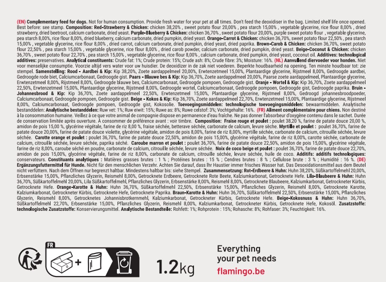 Constituants analytiques : matières grasses 1%, protéines 15%, cendres 8%, cellulose 3%, humidité 16%. Additifs : additifs technologiques : conservateurs. ⚠️ Ne convient pas aux chiots de moins de 4 mois. Conserver au sec, à l’abri du soleil, température ambiante.