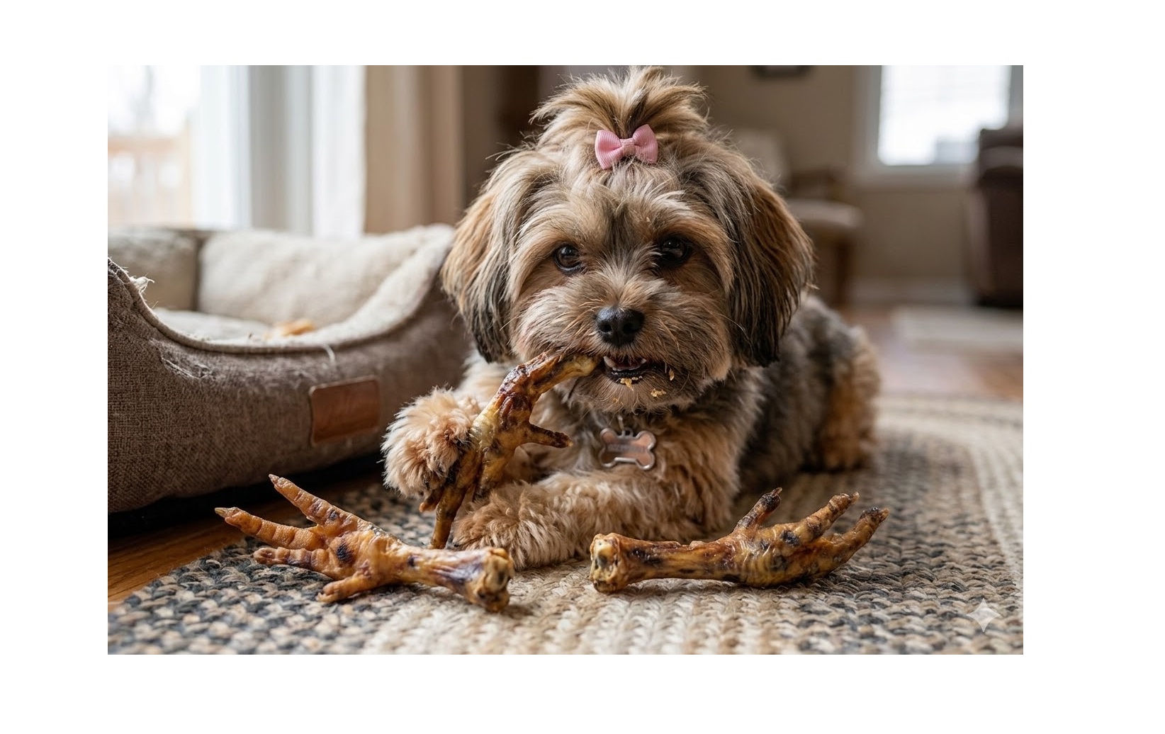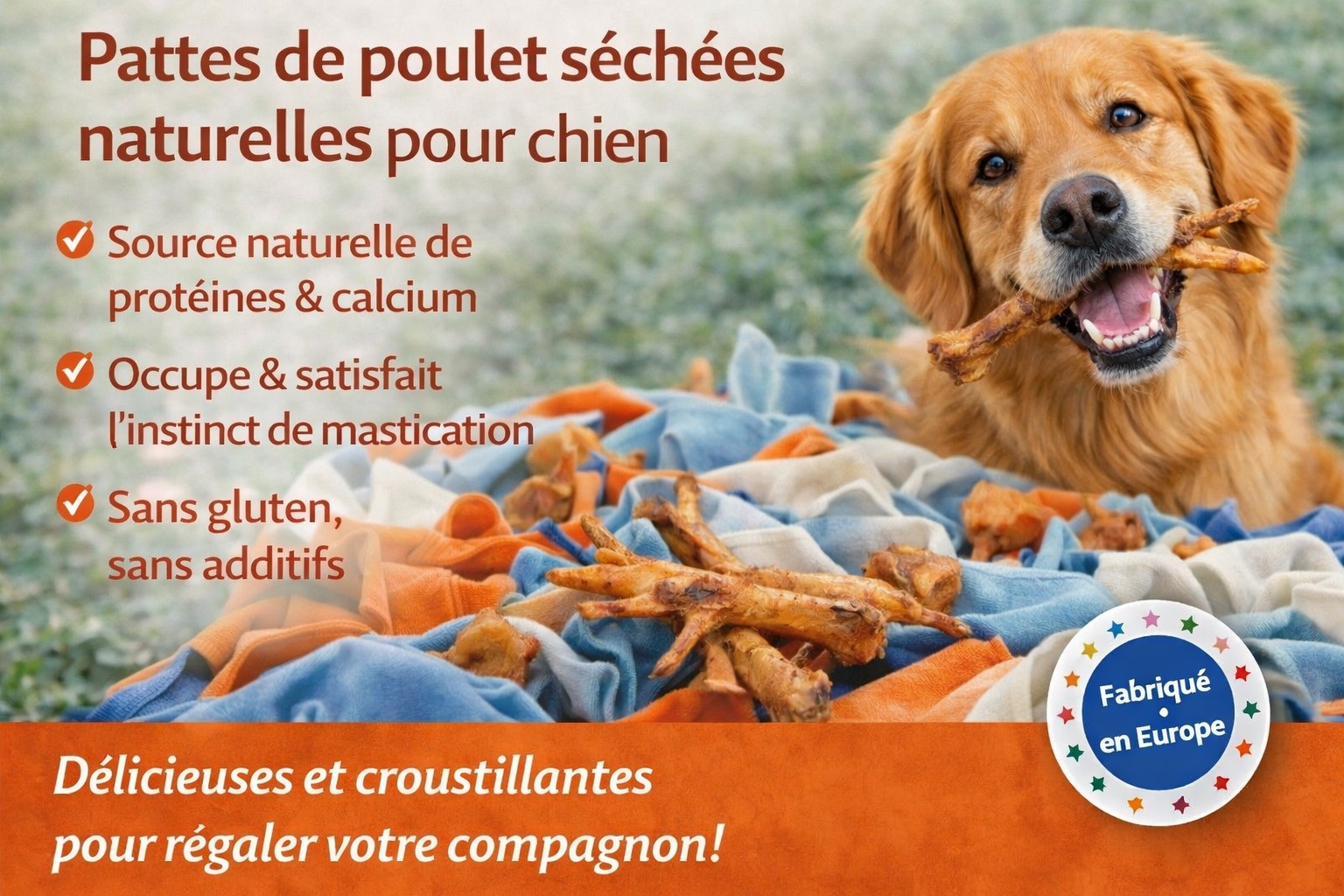 Faites plaisir à votre chien avec ces pattes de poulet séchées naturelles, une friandise croustillante et savoureuse idéale pour une récompense ou une occupation gourmande.