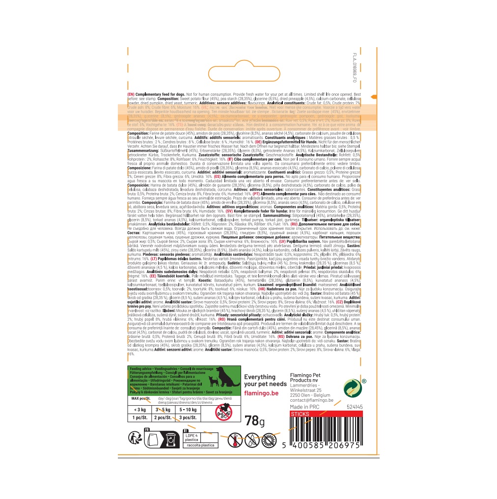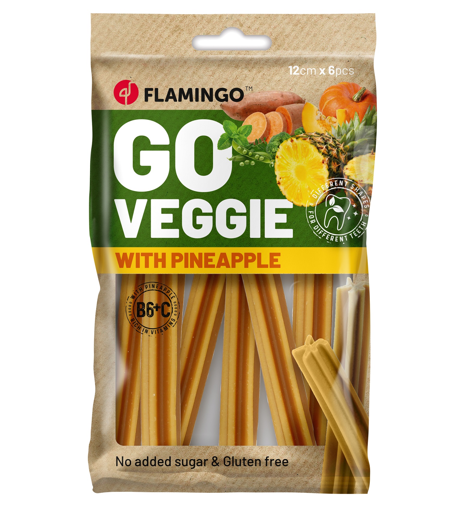 Caractéristiques : • Friandises végétariennes en bâtonnets (78 g – 6 pcs) • Saveur : ananas • Ingrédients 100 % d’origine végétale (patate douce) • Sans gluten et sans sucres ajoutés • Riches en fibres, vitamines, calcium et fer • Faibles en calories, riches en vitamine C • Favorisent digestion et hygiène dentaire • Aliment complémentaire pour chiens adultes • Convient à toutes les tailles de chiens • Utilisation : intérieur et extérieur • Ne convient pas aux chiots de moins de 6 mois • À conserver au sec et à l’abri du soleil