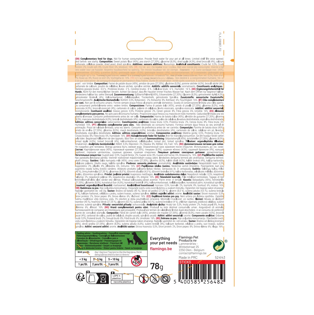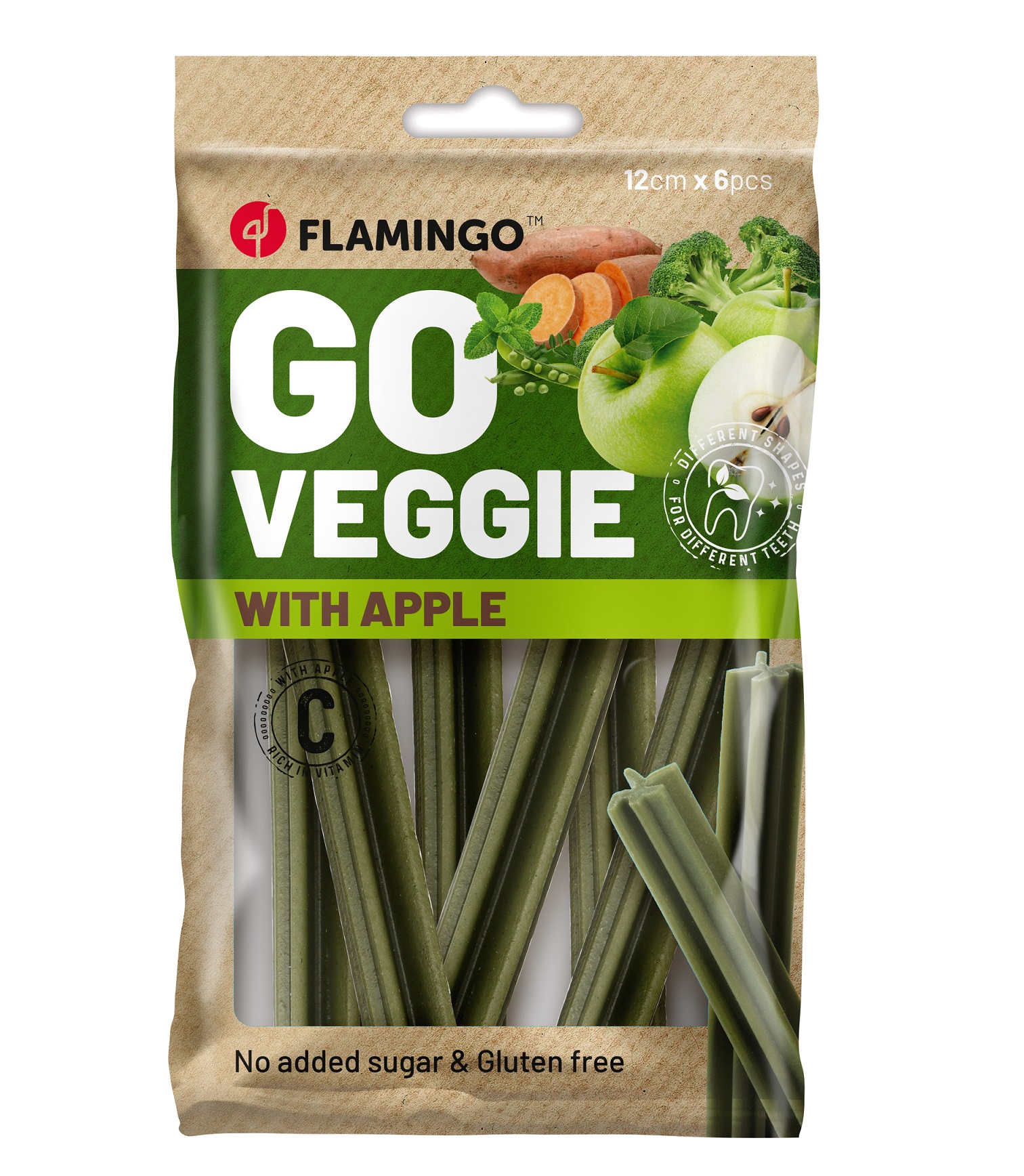 Caractéristiques : • Friandises végétariennes en bâtonnets (78 g – 6 pcs) • Saveur : pomme • Ingrédients 100 % d’origine végétale (patate douce) • Sans gluten et sans sucres ajoutés • Riches en fibres, vitamines, calcium et fer • Faibles en calories, riches en vitamine C • Favorisent digestion et hygiène dentaire • Aliment complémentaire pour chiens adultes • Convient à toutes les tailles de chiens • Utilisation : intérieur et extérieur • Ne convient pas aux chiots de moins de 6 mois • À conserver au sec et à l’abri du soleil