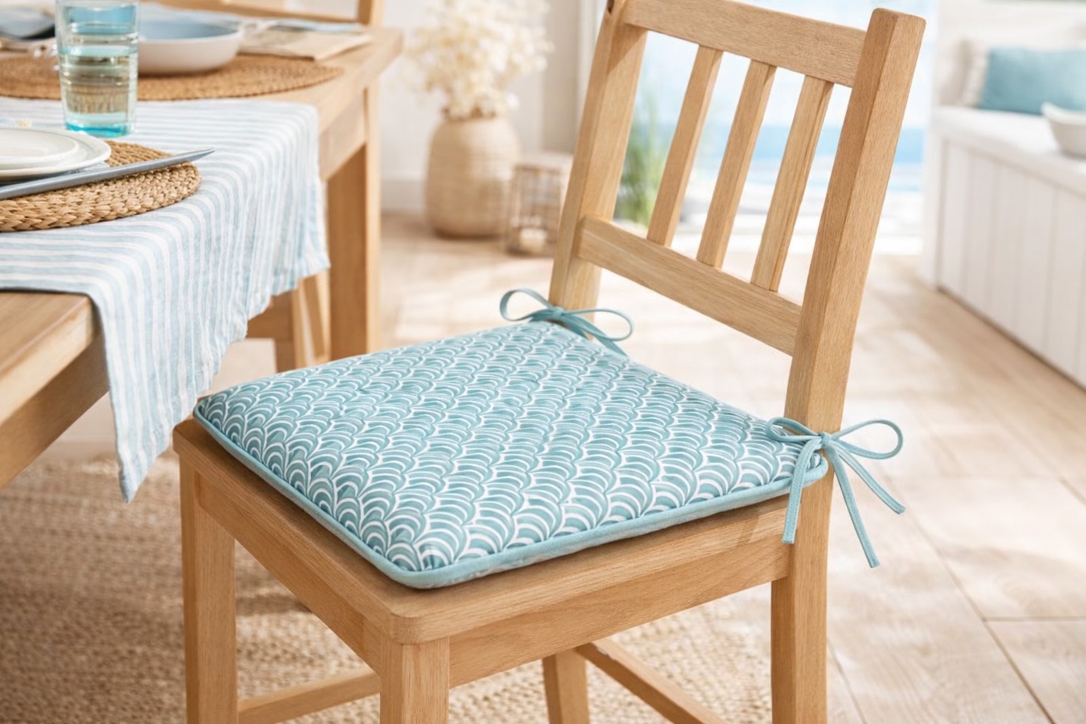 - Finition : biais et liens d’attache pour fixation sur la chaise