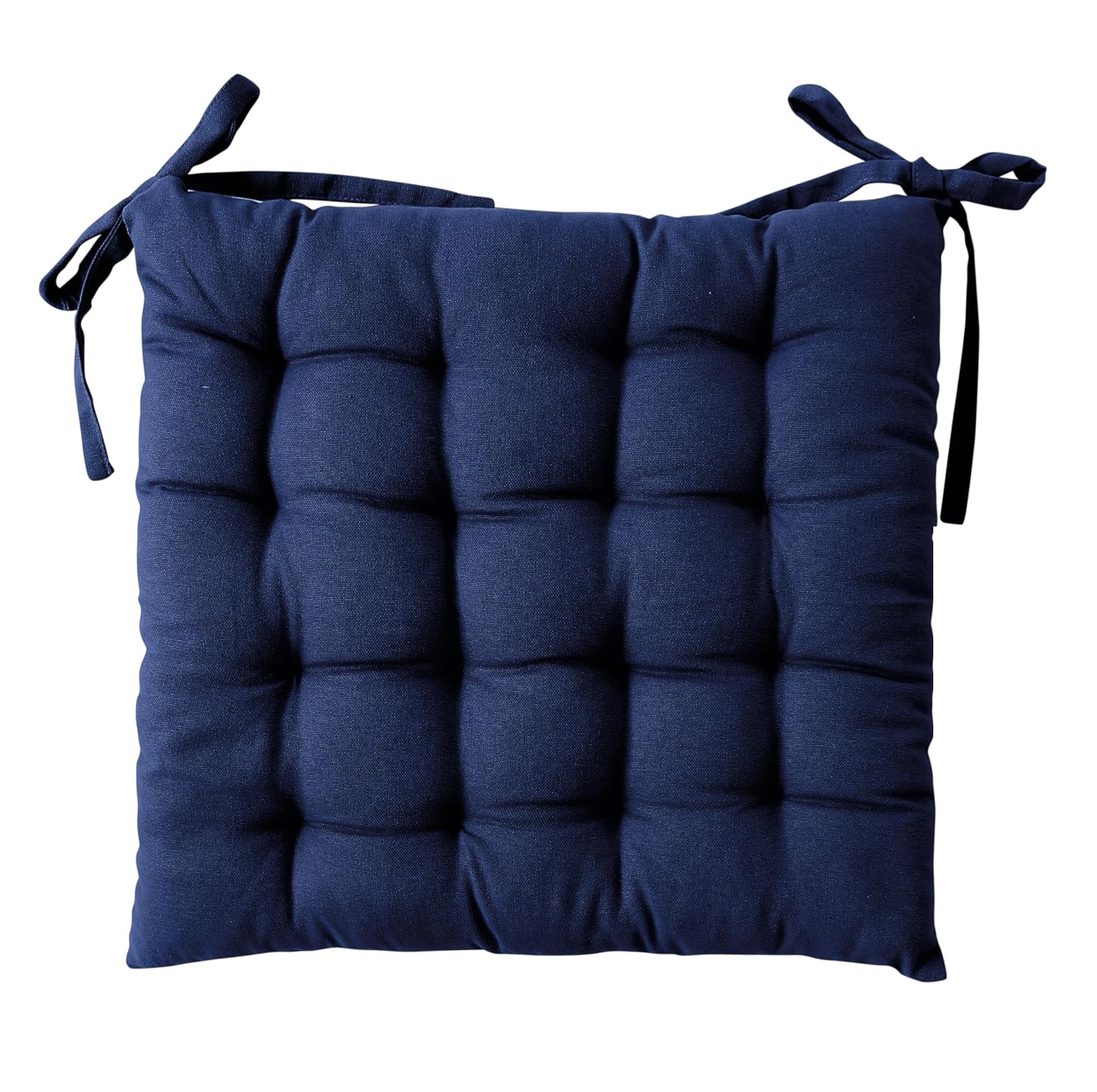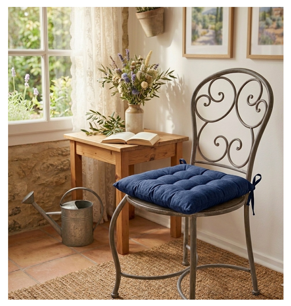 Caractéristiques : • Dimensions : 38 x 38 cm • Forme : carrée • Coloris : bleu marine • Matière : 100% coton • Garnissage : 100% coton recyclé • Tissu : half panama • Finition : matelassé 16 points • Fixation : 4 nouettes • Certification : BSCI • Confort : moelleux et durable