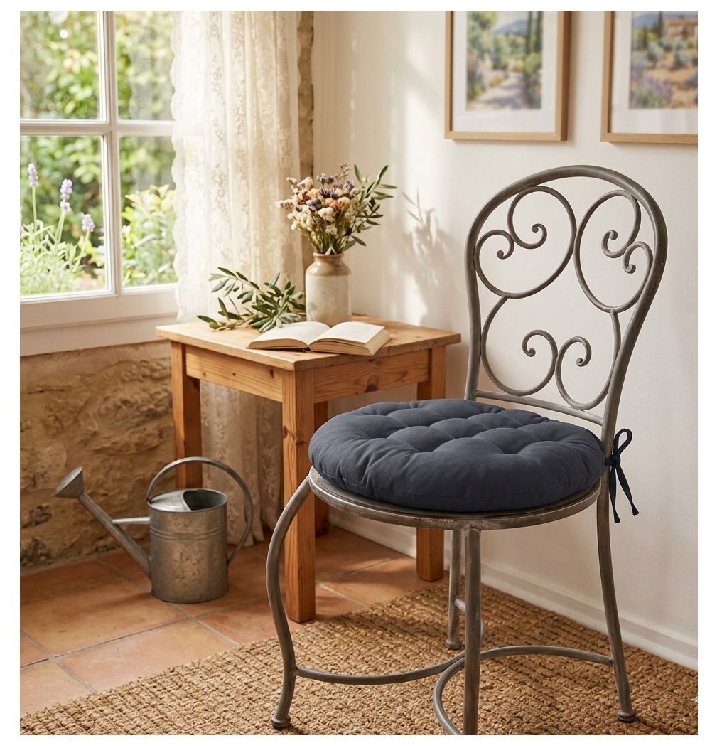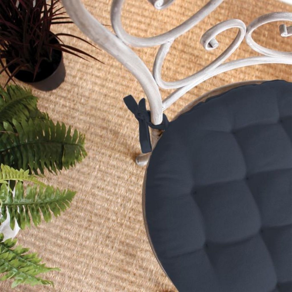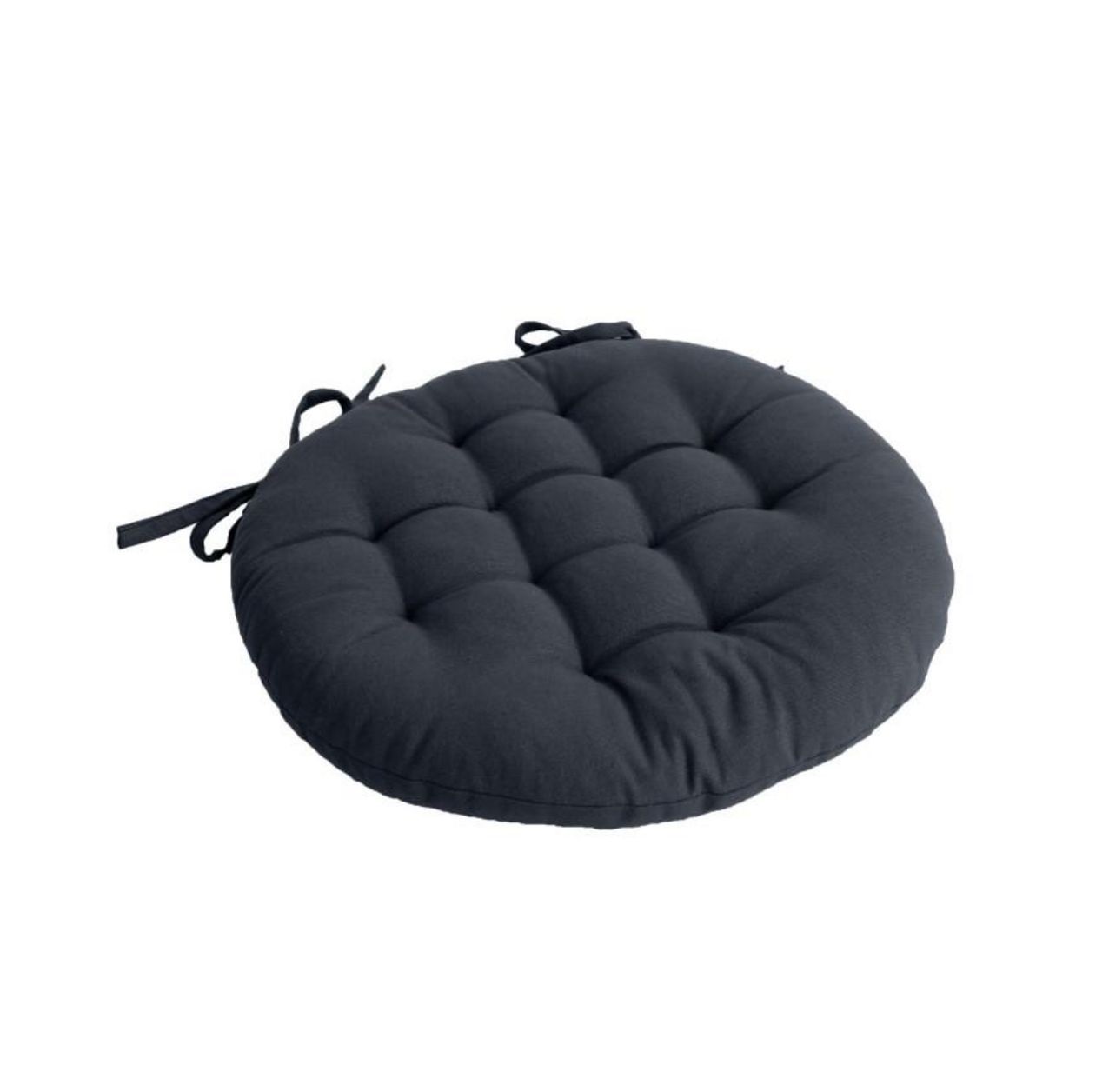 Caractéristiques : • Dimensions : 38 x 38 x 5 cm • Forme : ronde • Coloris : anthracite • Matière : 100% coton • Garnissage : 100% coton recyclé • Tissu : half panama • Finition : matelassé 12 points • Fixation : 2 nouettes • Certification : BSCI • Confort : moelleux et durable