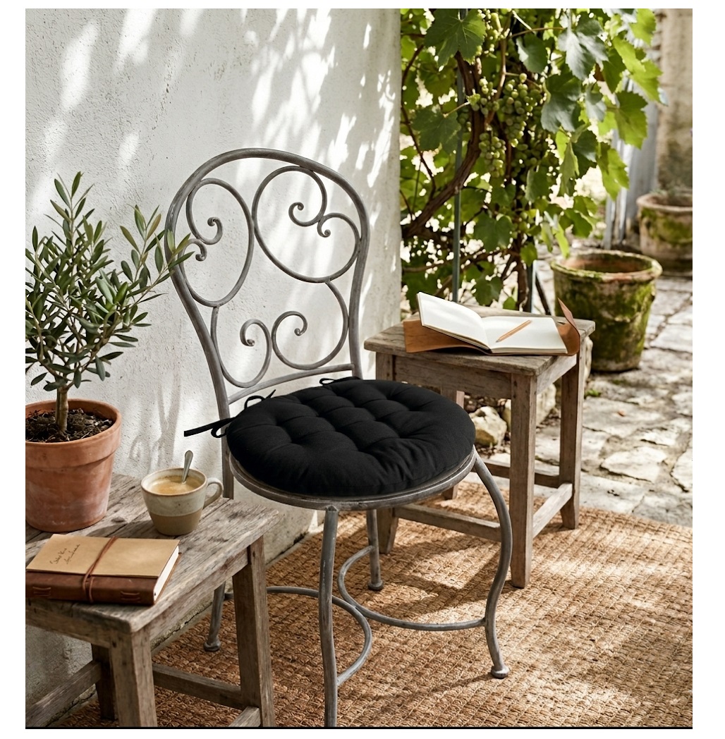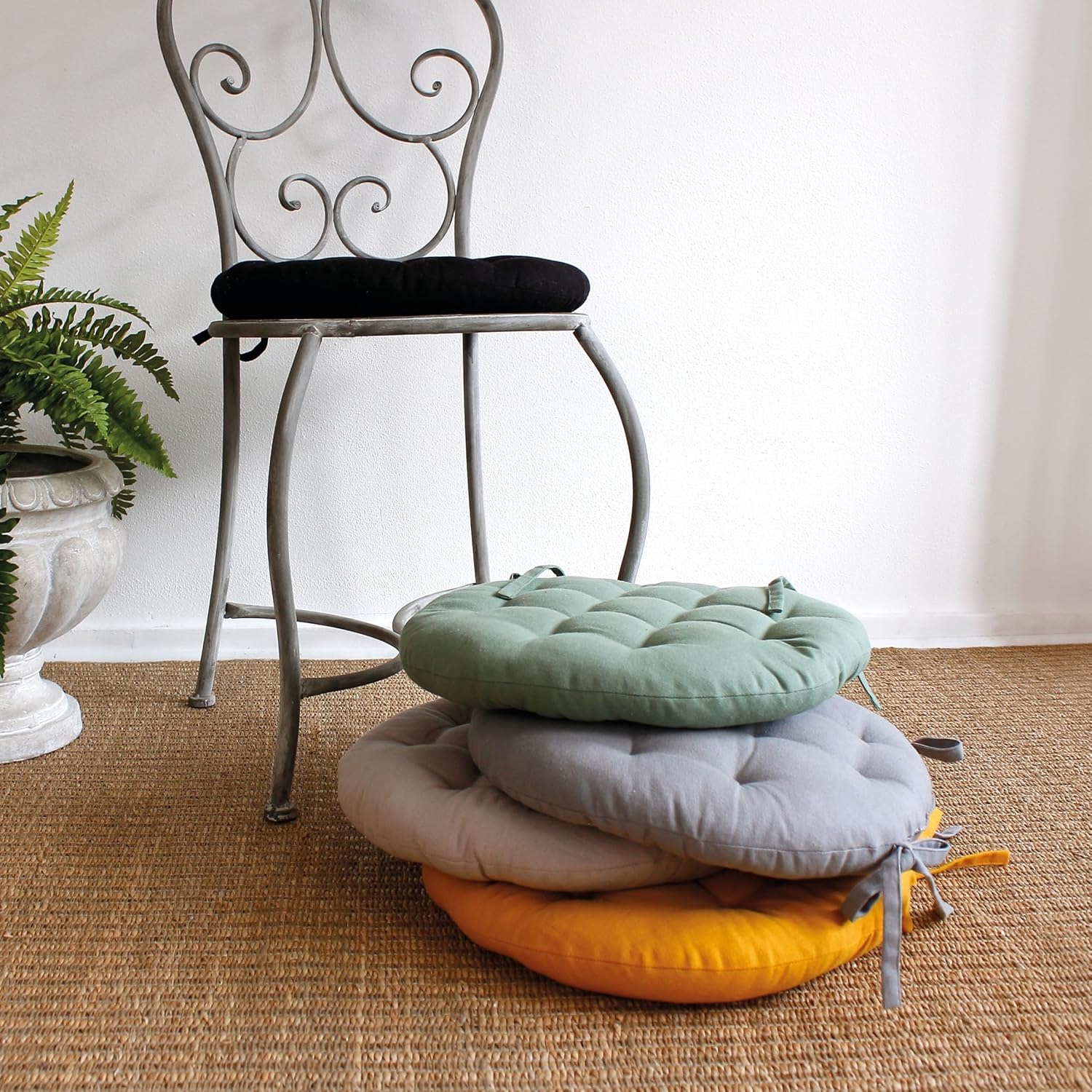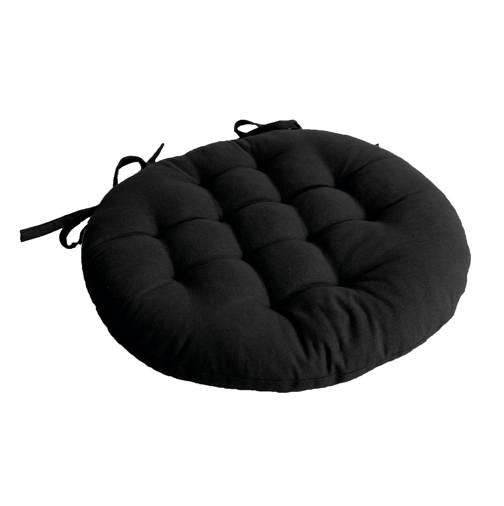 Caractéristiques : • Dimensions : 38 x 38 x 5 cm • Forme : ronde • Coloris : noir • Matière : 100% coton • Garnissage : 100% coton recyclé • Tissu : half panama • Finition : matelassé 12 points • Fixation : 2 nouettes • Certification : BSCI • Confort : moelleux et durable