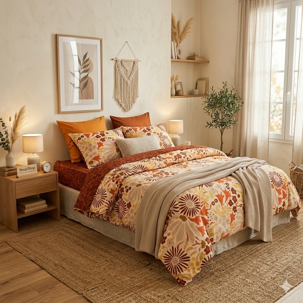Offrez une ambiance chaleureuse et vintage à votre chambre avec cette parure de lit aux motifs floraux rétro dans des tons bruns, crème et jaunes. Le recto présente un imprimé floral généreux et lumineux, tandis que le verso arbore un motif discret brun pour varier les ambiances.