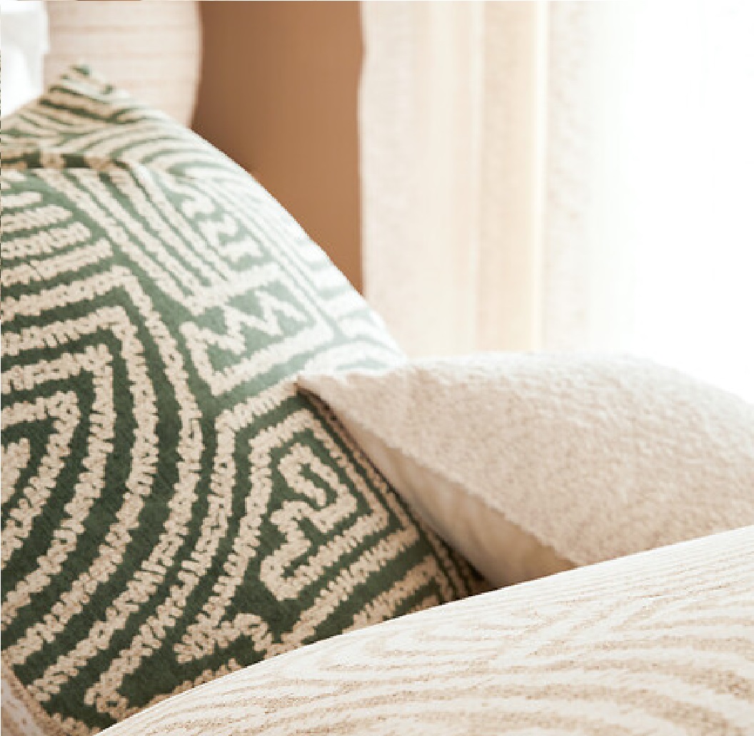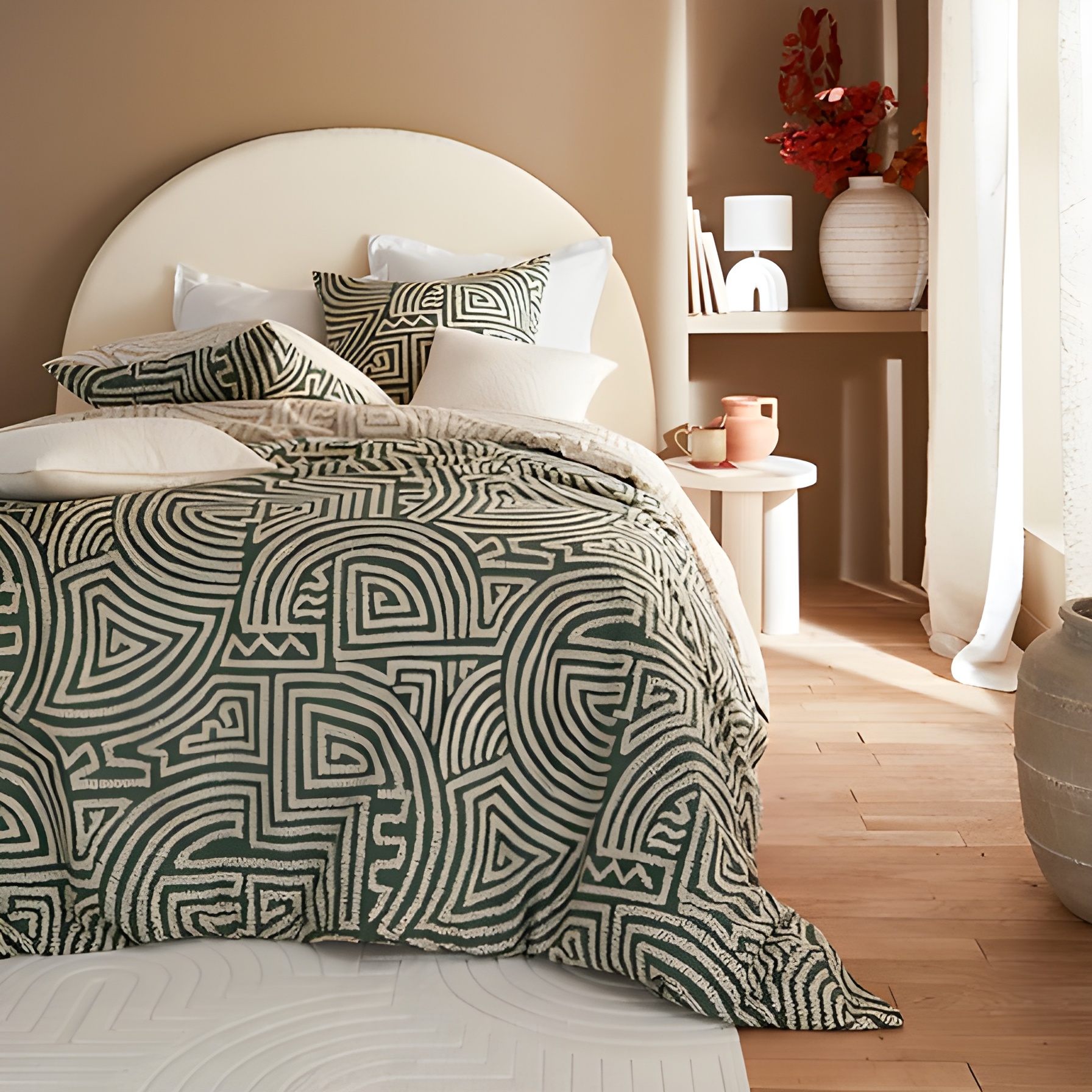 Apportez une touche graphique et élégante à votre chambre avec cette parure de lit réversible. Le recto présente un motif géométrique vert profond sur fond écru, tandis que le verso inverse les couleurs pour un style plus doux et lumineux.