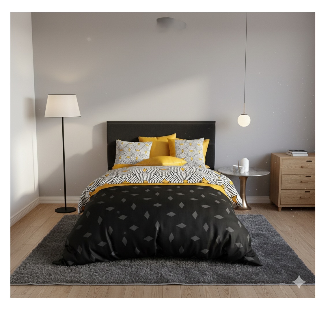 Style contemporain et dynamique : contrastes forts et imprimés géométriques originaux pour une chambre pleine de caractère.