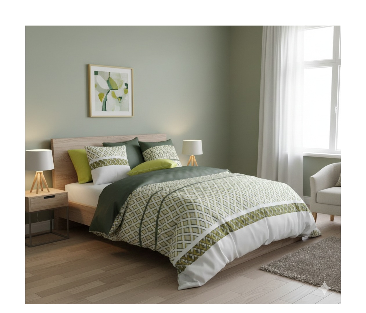 🛏️ Taille idéale pour lit double : housse de couette 220x240 cm + 2 taies 63x63 cm. 🌿 Coton 100% – 57 fils/cm² : douceur, confort et respirabilité assurés. 🧼 Entretien simplifié : lavable en machine, résiste aux lavages fréquents. 🎨 Motif géométrique tendance : couleurs vert olive, anis et blanc pour une déco fraîche et contemporaine.