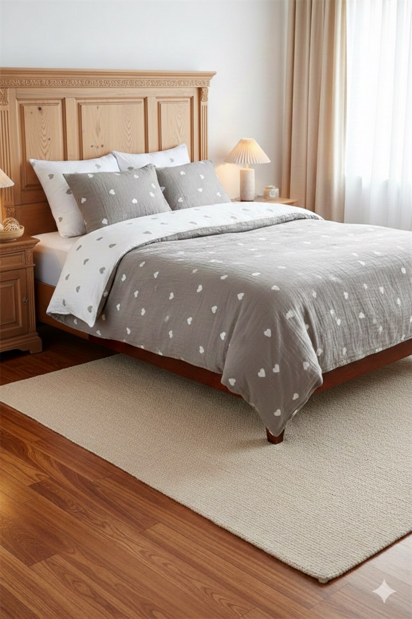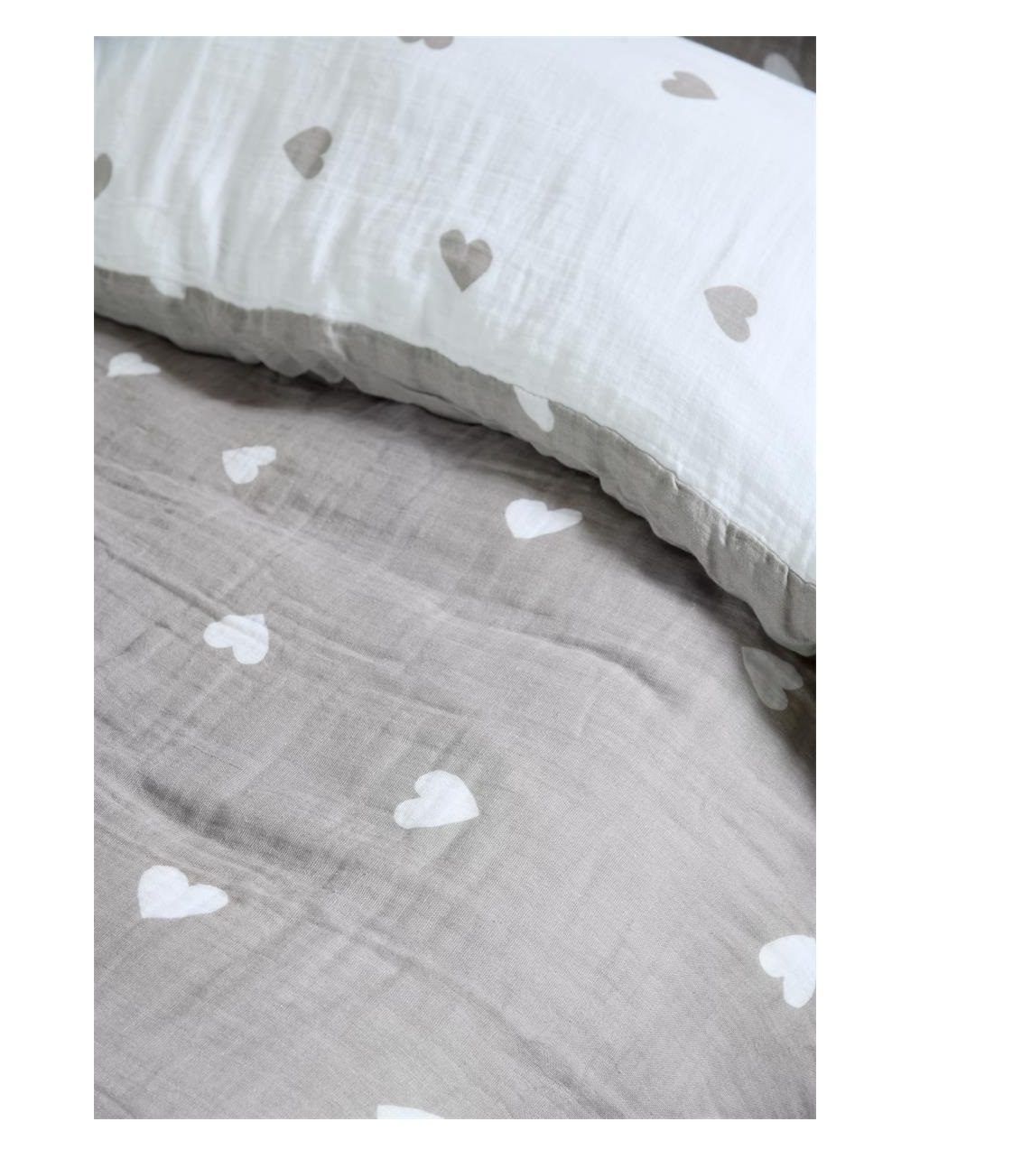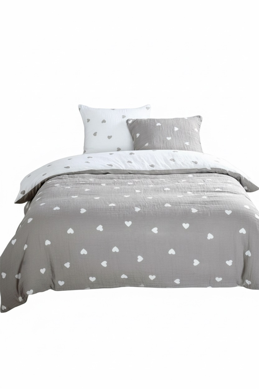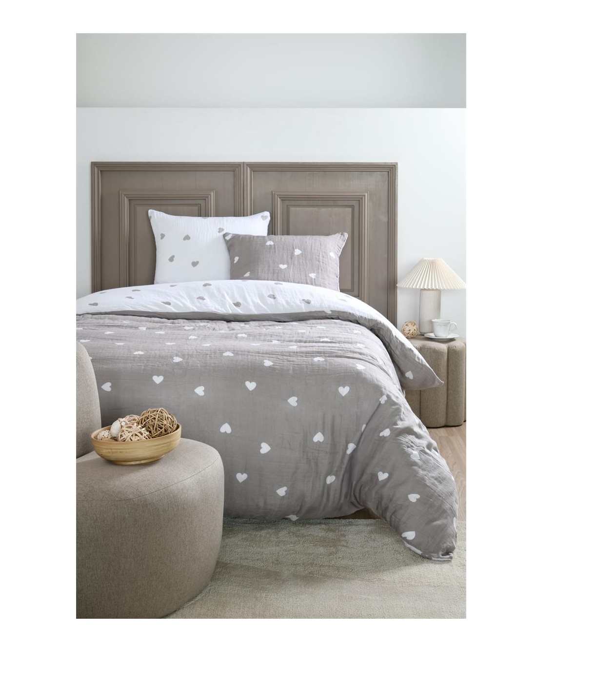 Apportez douceur et élégance à votre chambre avec cette parure de lit en double gaze de coton 100 %, au coloris taupe délicat orné d’un motif cœur, imprimé au recto comme au verso pour un rendu harmonieux.