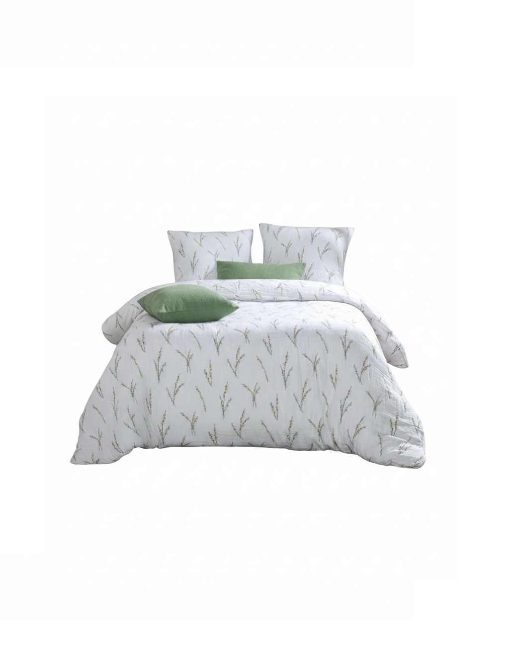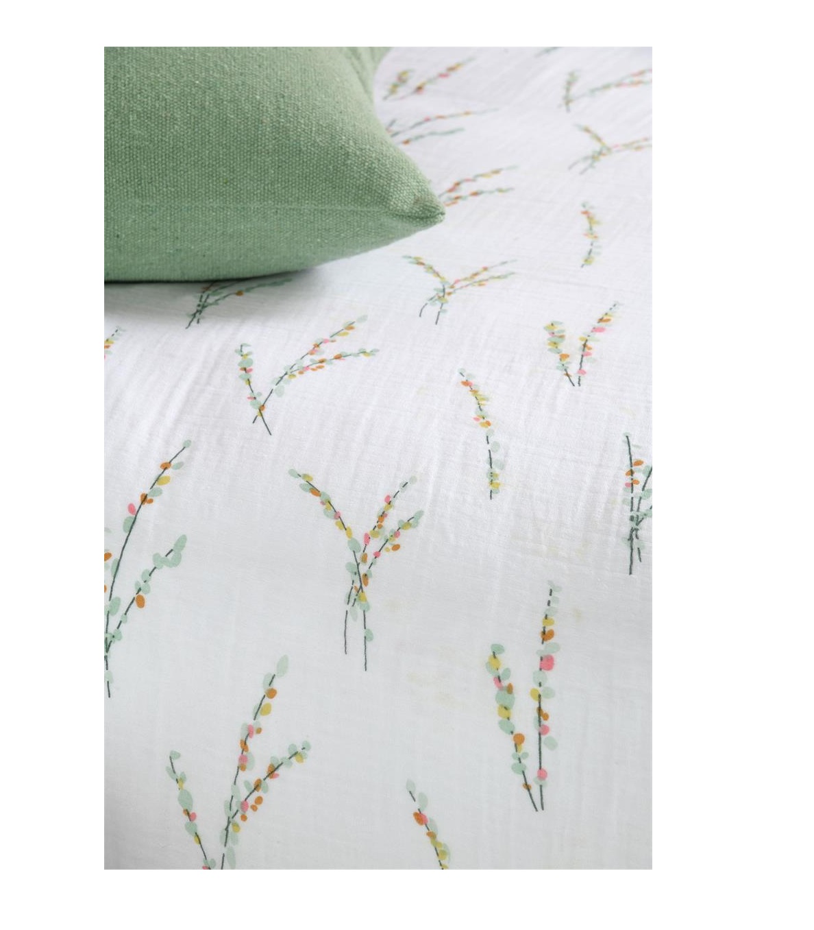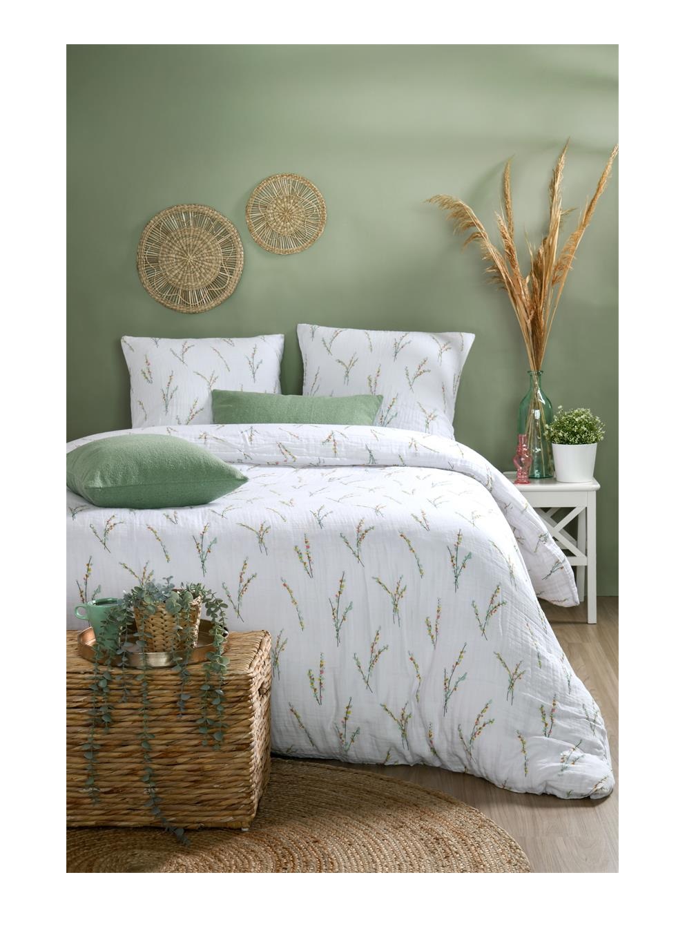 Apportez une ambiance douce et naturelle à votre chambre avec cette parure de lit en double gaze de coton 100 %, au motif végétal délicat, imprimé au recto et au verso pour un rendu harmonieux.