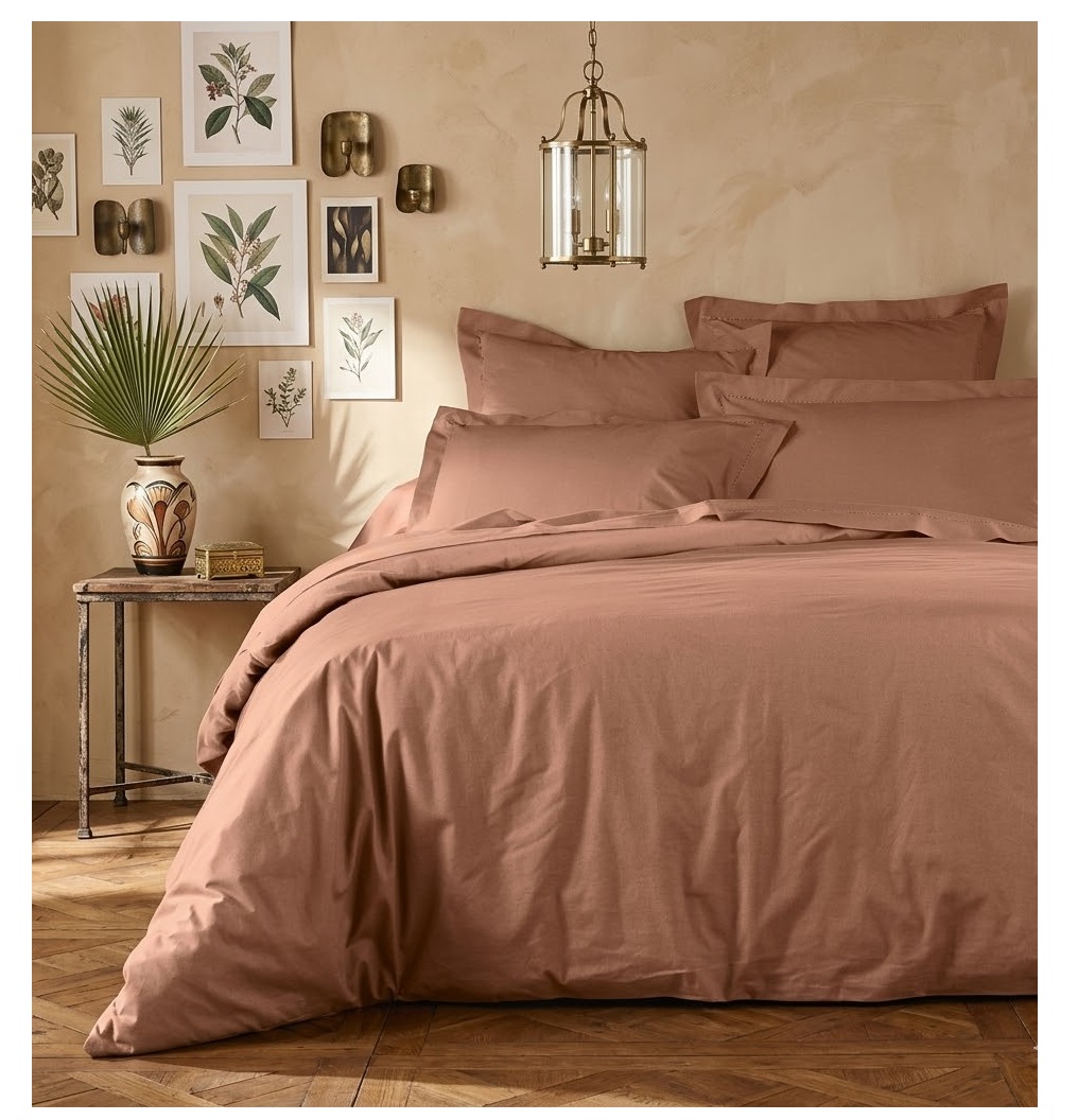 • Dimension : 220 x 240 cm (lit 2 personnes) • Matière : 100% coton • Finition : 57 fils/cm² – boutons-pressions • Couleur : blush • Entretien : lavage 30°C
