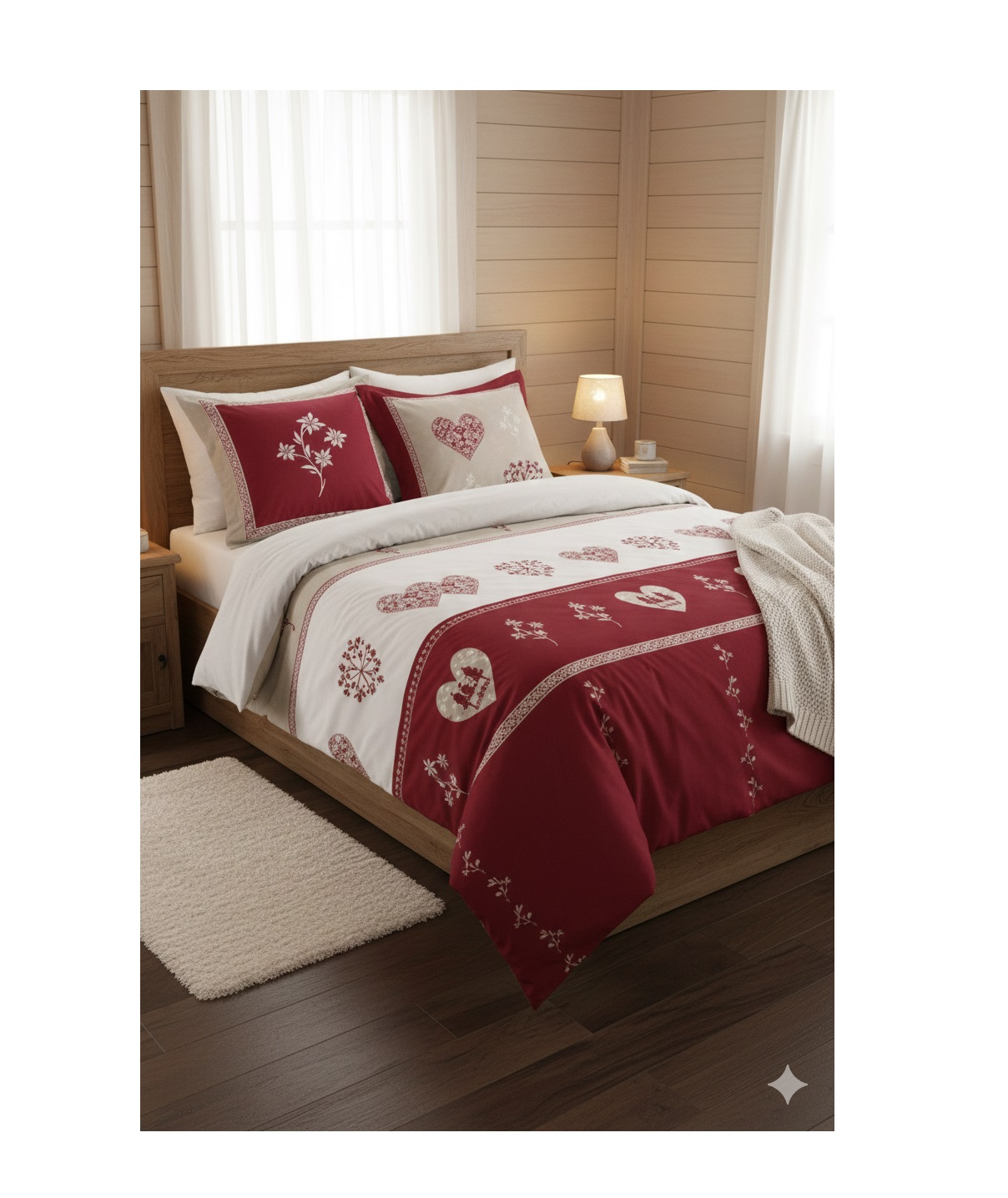Créez une ambiance chaleureuse et authentique dans votre chambre avec cette parure de lit esprit chalet. Ses motifs cœurs et flocons rouges et beiges évoquent la montagne et les soirées cocooning. Confectionnée en pur coton, elle offre douceur, confort et un rendu soigné grâce à son dessin placé.