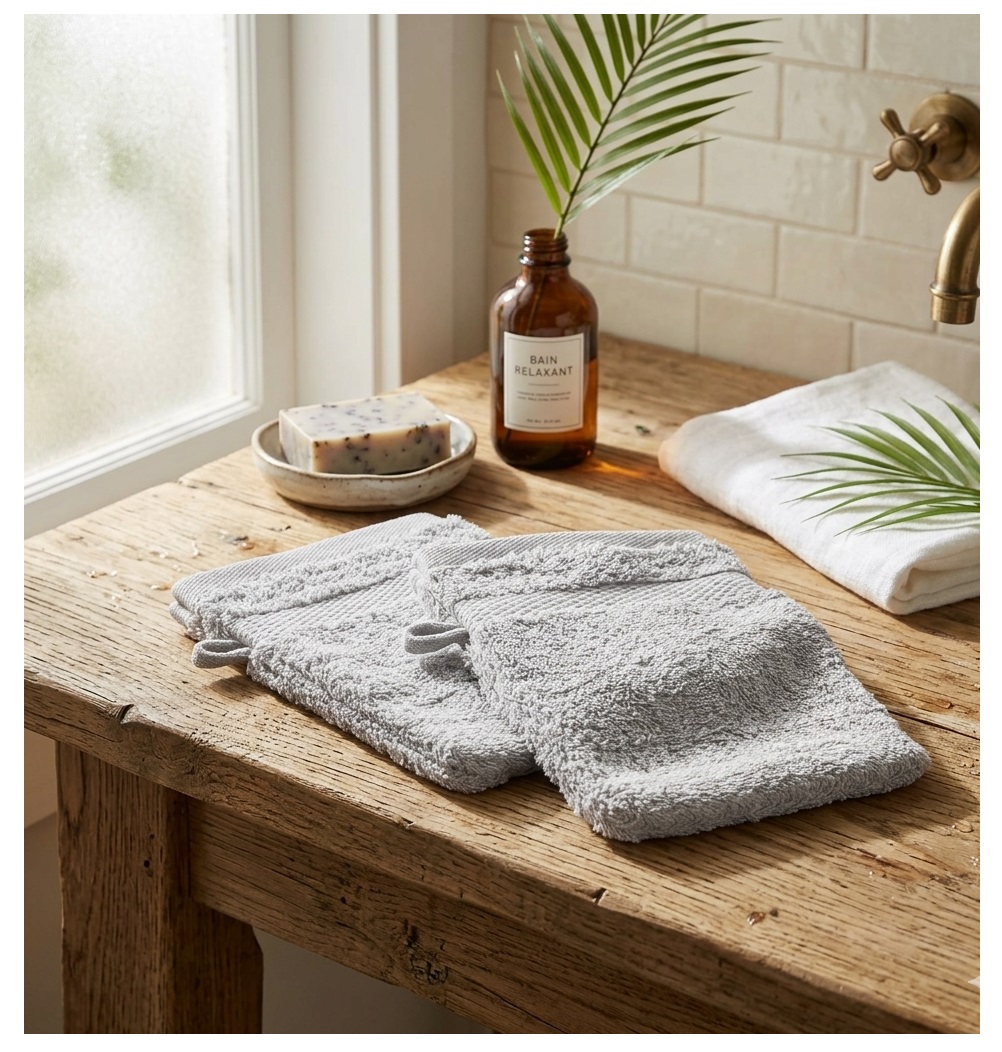• Lot : 2 gants de toilette • Dimensions : 15 x 21 cm • Matière : 100 % coton éponge • Grammage : 600 g/m² (doux et très absorbant) • Couleur : gris perle • Finition : uni élégant