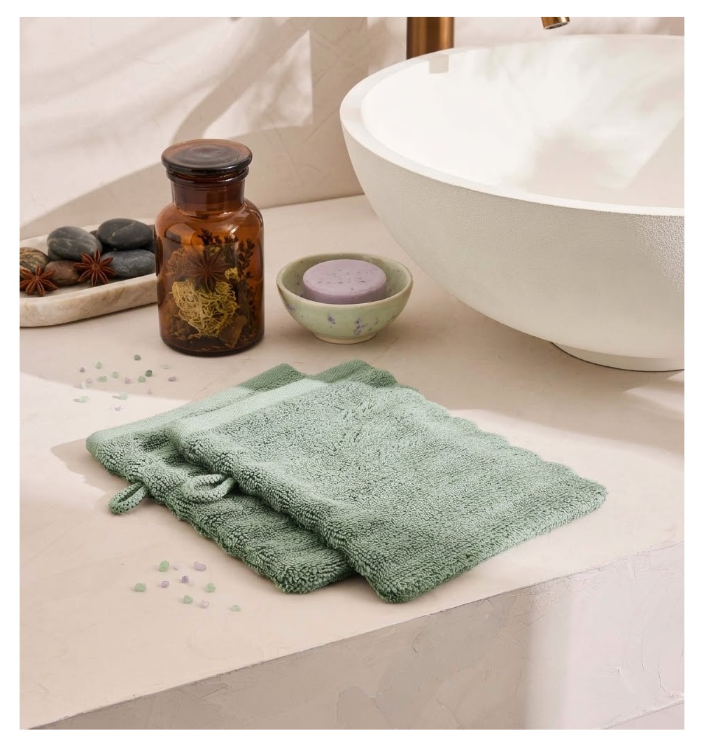 Dimensions : 15 x 21 cm Matière : 100% coton éponge Grammage : 500 g/m² Couleur : Sauge Motif : Uni Entretien : Lavable en machine à 40°