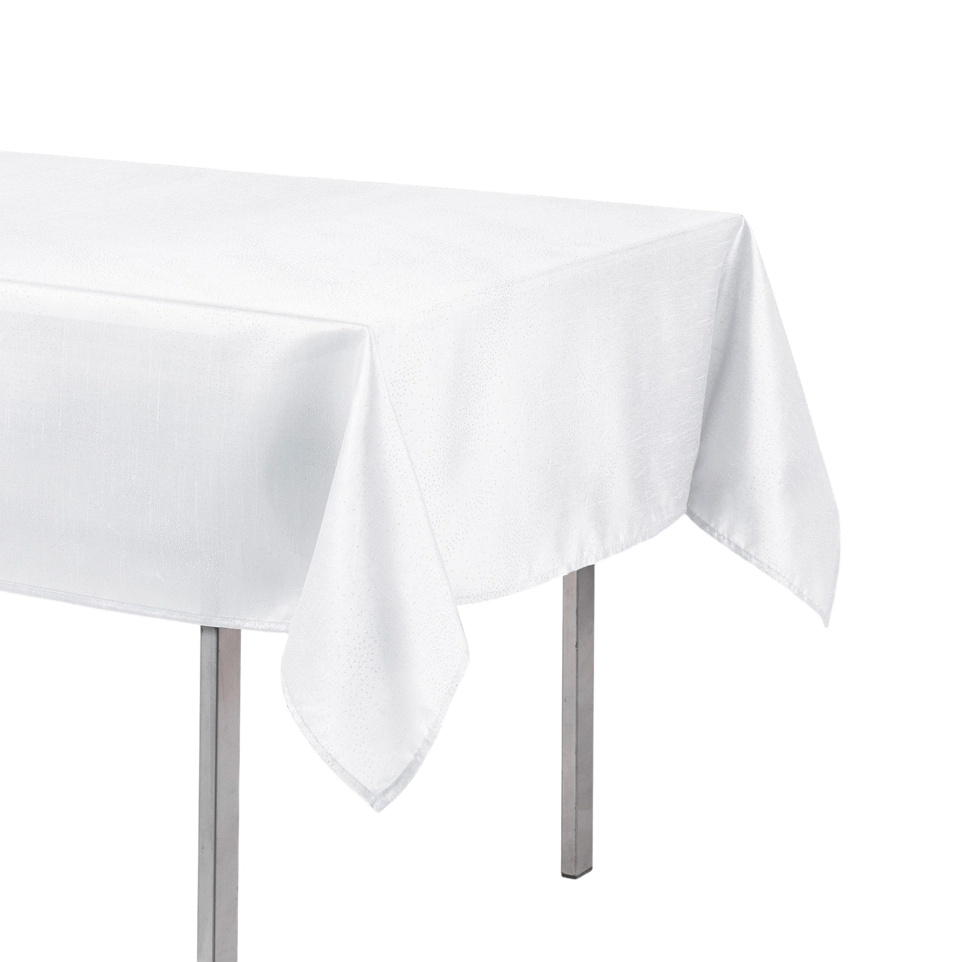 Apportez une touche d'élégance à votre table avec cette magnifique nappe en polyester Schantung, à l’aspect soyeux et légèrement texturé. Son tissu blanc lumineux est subtilement orné d’appliqués scintillants, pour une décoration chic et festive, idéale pour les grandes occasions comme pour les repas du quotidien.