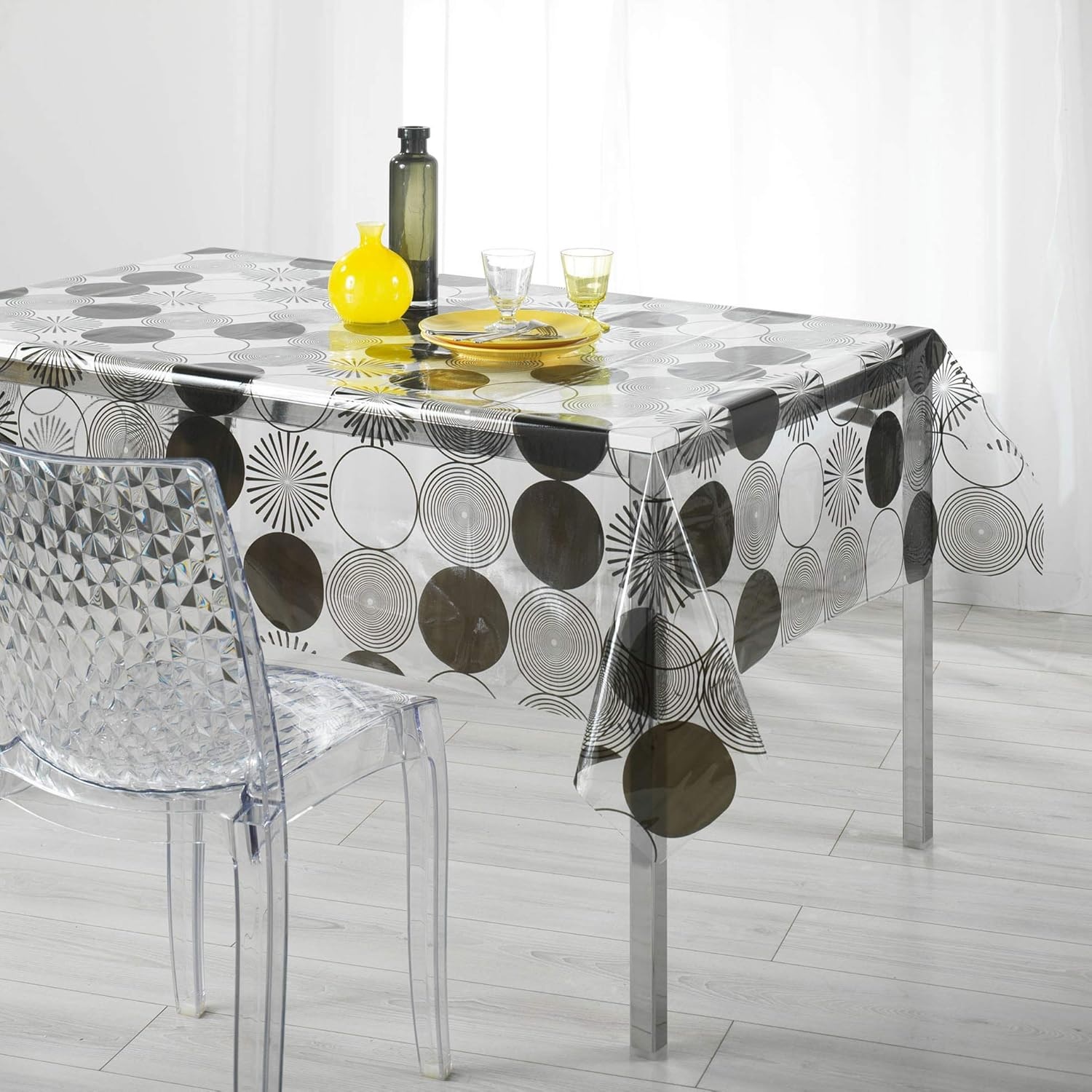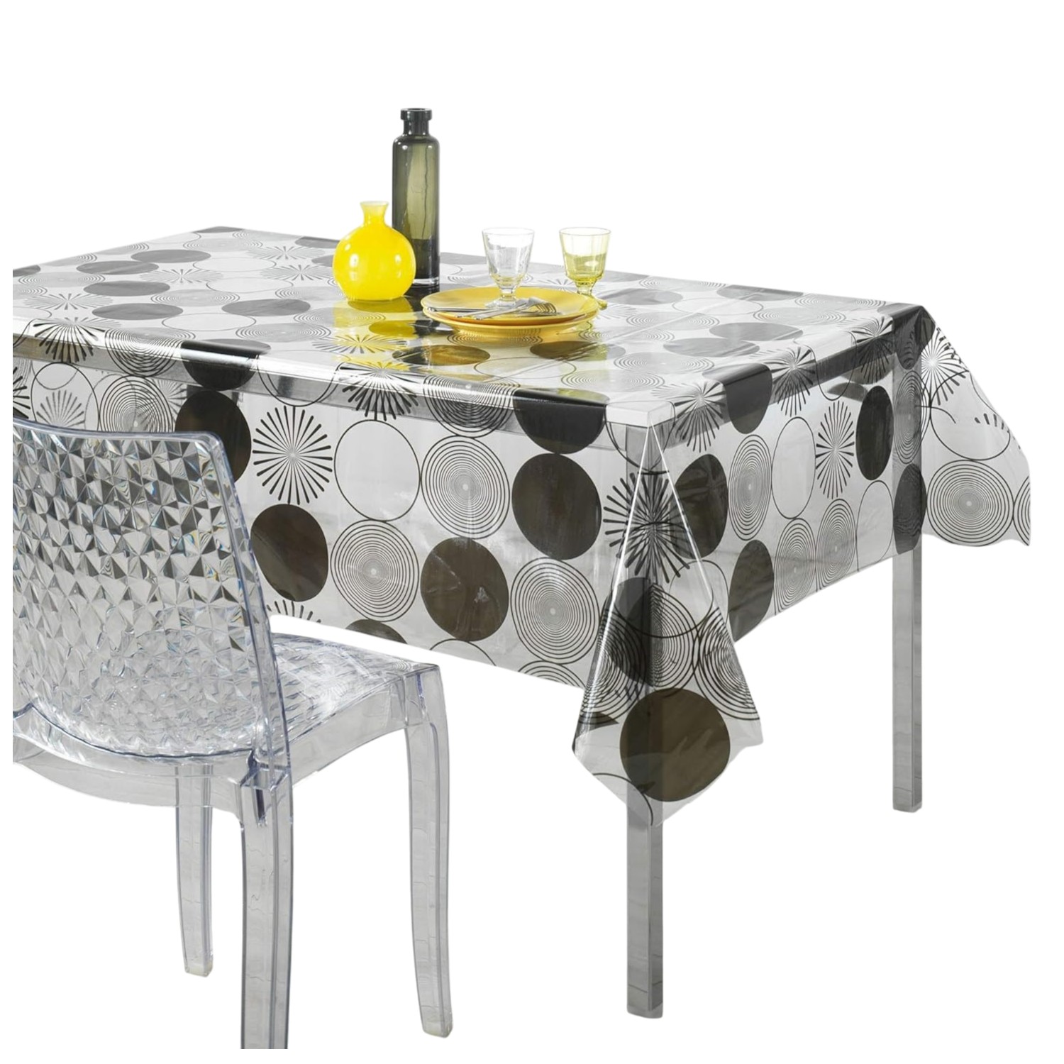 Apportez une touche moderne et élégante à votre intérieur avec cette nappe en PVC transparent 140x240 cm, décorée de motifs noirs géométriques.