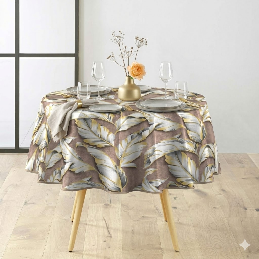 Les + produit : • Motif feuilles tendance avec finition pailletée élégante • Matière PVC résistante et imperméable • Entretien ultra simple : un coup d’éponge suffit • Belle tenue et tombé harmonieux • Idéale pour usage quotidien ou réception