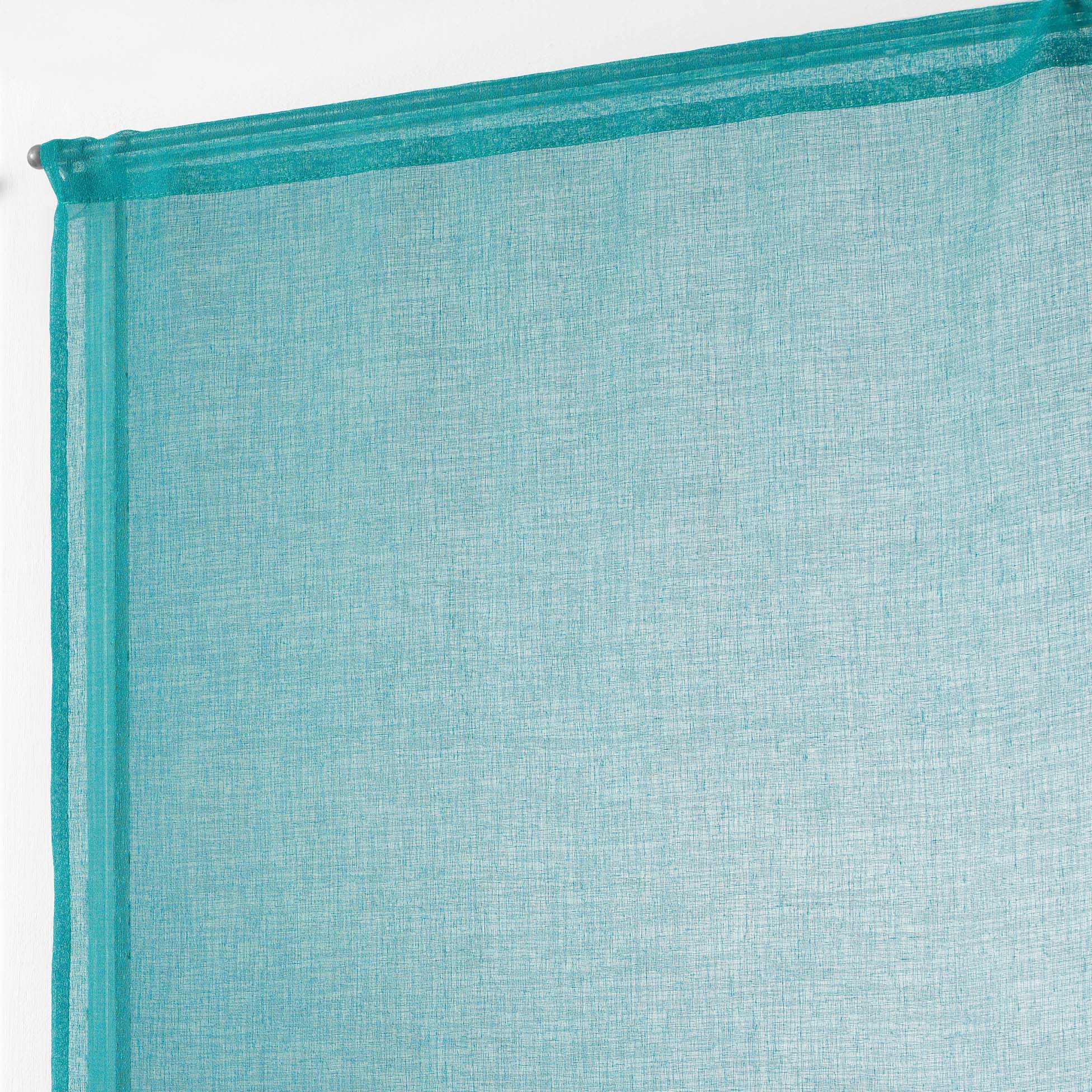 Caractéristiques : • Dimensions : 60 x 160 cm • Couleur : bleu • Matière : 100% polyester • Tissu : voile sable • Finition : passe tringle • Prêt à poser • Léger et lumineux • Installation facile et rapide