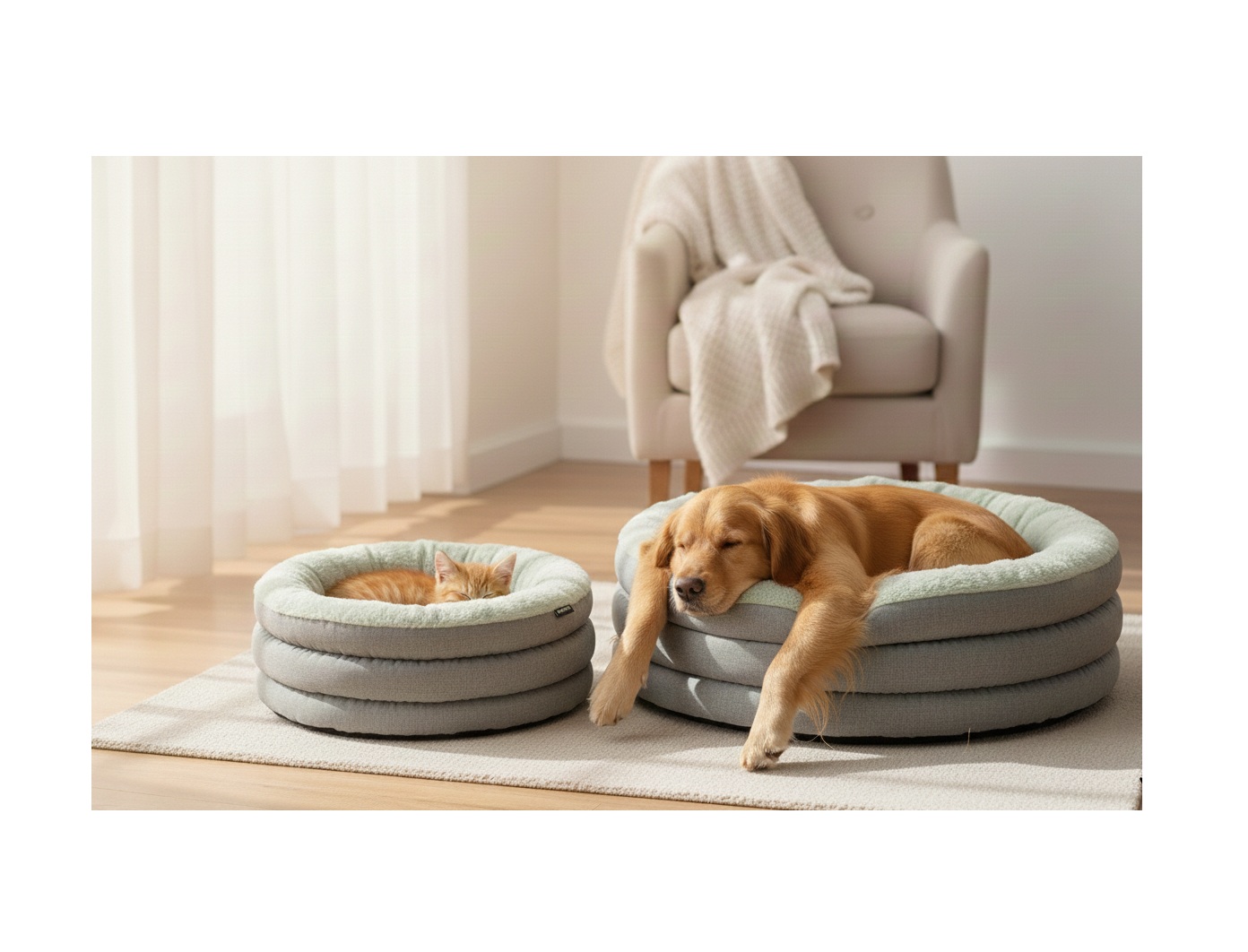 L’extérieur en textile résistant contraste harmonieusement avec l’intérieur en peluche douce, pour un couchage à la fois durable et ultra-confortable. Le coussin amovible double face, combinant textile et peluche, est garni de fibres de polyester moelleuses, offrant une surface de repos adaptée aux saisons et aux préférences de votre chat ou de votre chien.