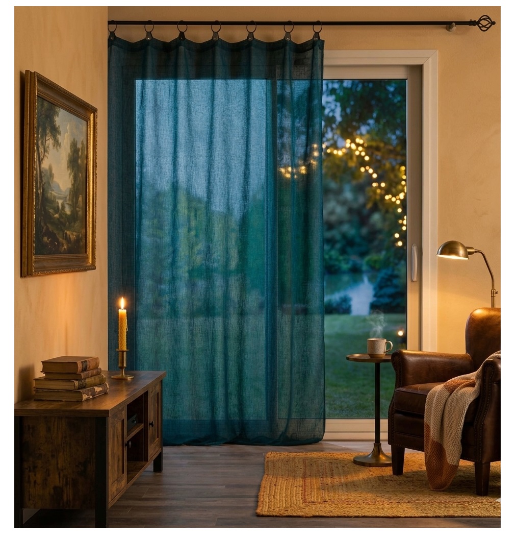Sa finition à anneaux en métal noir assure une installation rapide et un tombé fluide pour un rendu décoratif soigné.