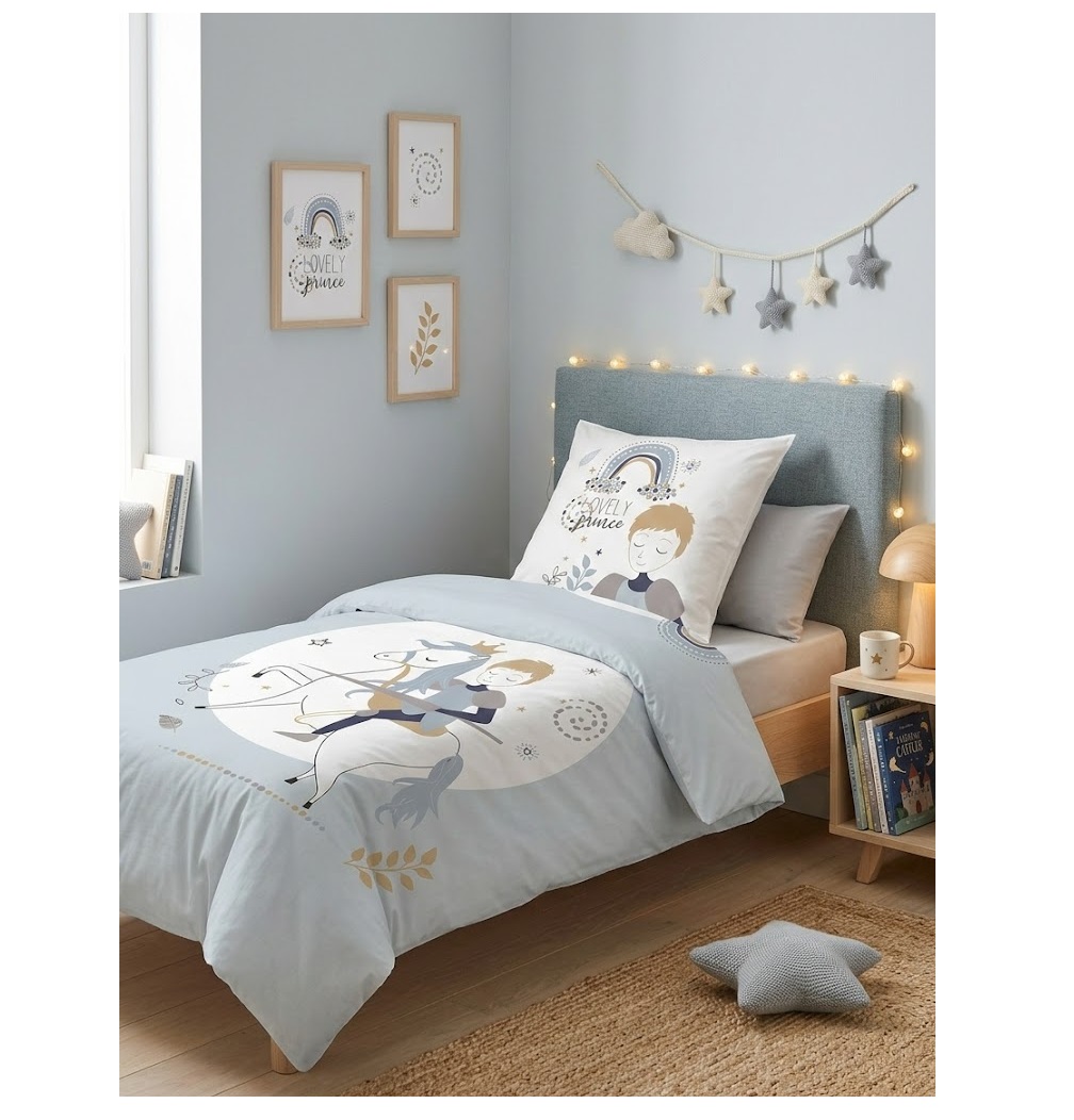 Caractéristiques : – Housse de couette : 140x200 cm – 1 taie d’oreiller : 63x63 cm sac – Matière : 100 % coton – Qualité : imprimé 47 fils/cm² – Couleurs : bleu et blanc – Fermeture housse : boutons-pressions – Certification : Oeko-Tex®