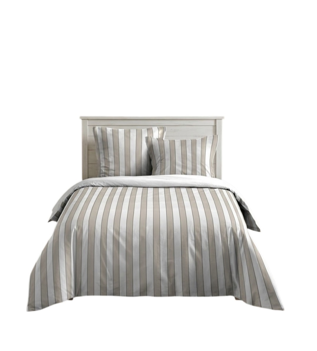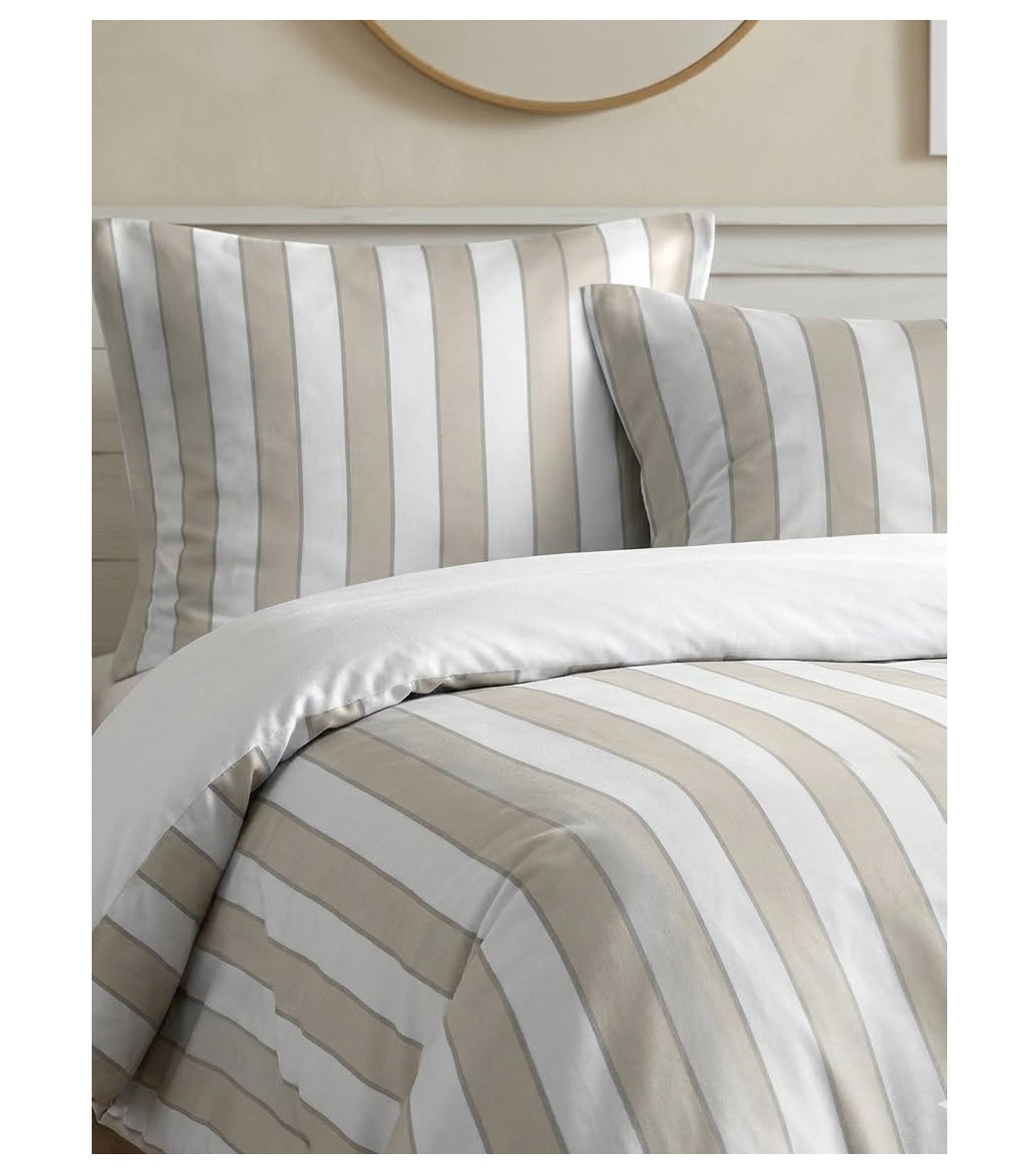 • Modèle : parure de lit Armel • Motif : rayures beige et blanc • Dimensions housse de couette : 220 x 240 cm • Composition : 100 % coton • Contenu : 1 housse de couette + 2 taies d’oreiller • Style : moderne / intemporel • Entretien : lavage en machine à 30°