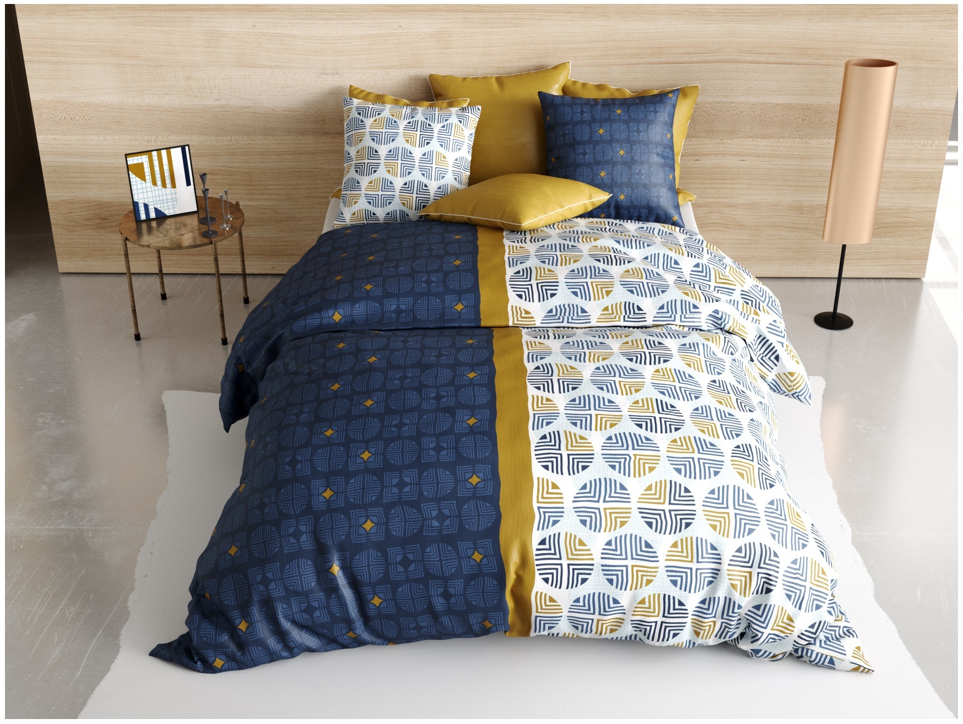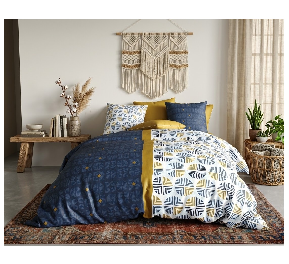 Son motif géométrique bleu crée une ambiance contemporaine idéale pour une chambre à coucher tendance.