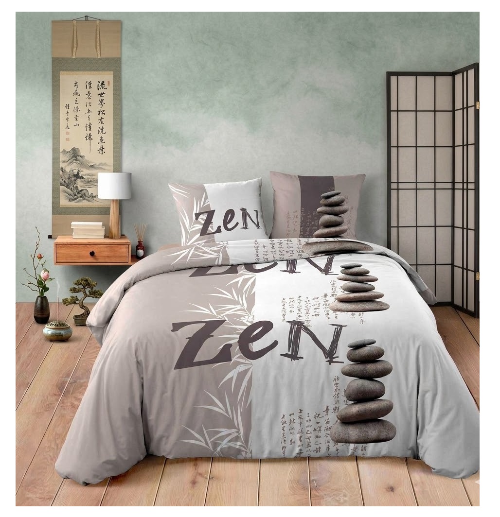 • Parure 2 personnes : 240 x 220 cm • 1 housse de couette + 2 taies (63 x 63 cm) • Matière : 100% coton, 42 fils/cm² • Motif galets zen, ambiance relaxante • Coloris : taupe élégant • Lavable à 40°C • Compatible sèche-linge • Taies avec volant plat