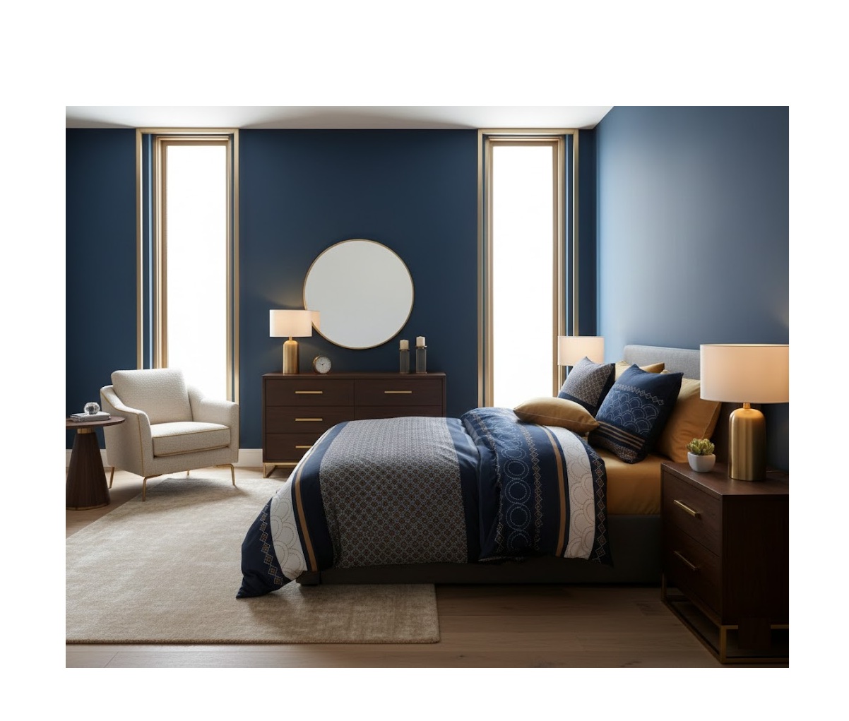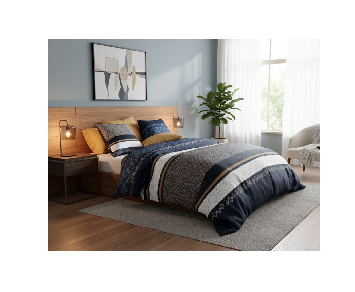 Apportez caractère et élégance à votre chambre avec la parure de lit Calypso. Son design graphique aux inspirations ethniques chic associe harmonieusement des motifs géométriques raffinés et des teintes profondes de bleu, relevées par des touches de jaune et de blanc. Un style affirmé qui crée une atmosphère chaleureuse et contemporaine.