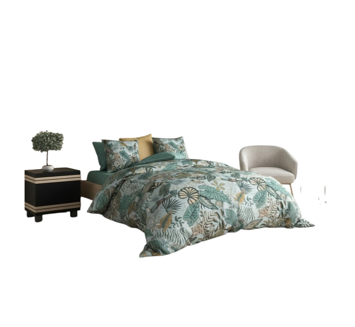 Transformez votre chambre en un véritable havre de fraîcheur avec cette parure de lit en coton au motif tropical raffiné. Ses feuillages luxuriants et ses nuances harmonieuses de vert, beige et naturel apportent une ambiance apaisante et contemporaine, parfaite pour une décoration moderne ou nature.