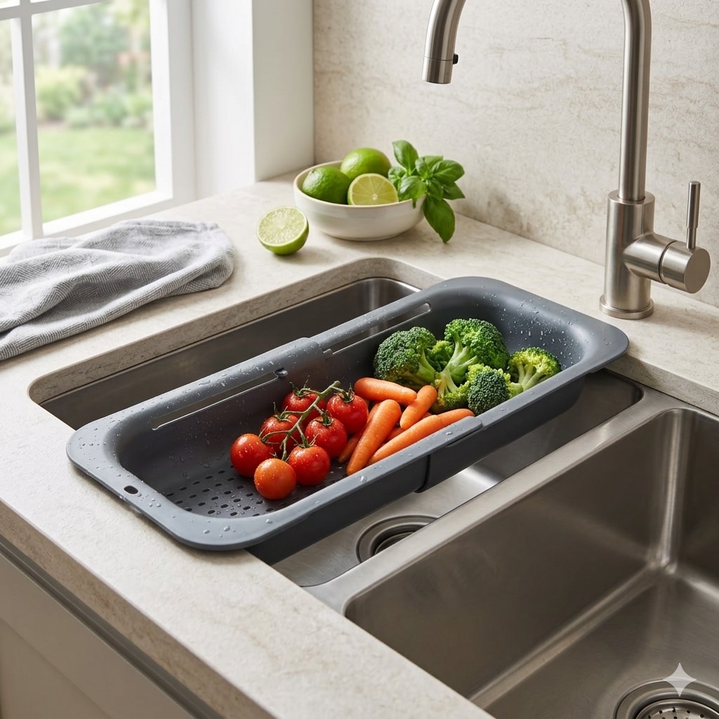 ✔️ Dimensions : Longueur ajustable de 34,4 à 47,8 cm ✔️ Utilisation : Se déploie pour se poser en travers de l’évier ✔️ Coloris : Gris ou vert (selon arrivage) ✔️ Matière : Polypropylène solide, léger et facile à nettoyer ✔️ Polyvalente : Idéale pour rincer fruits, légumes, pâtes… ✔️ Gain de place : Se rétracte pour un rangement pratique