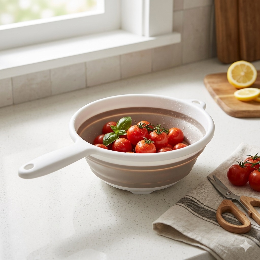 Gagnez de la place en cuisine avec cette passoire rétractable avec manche, pratique et fonctionnelle.